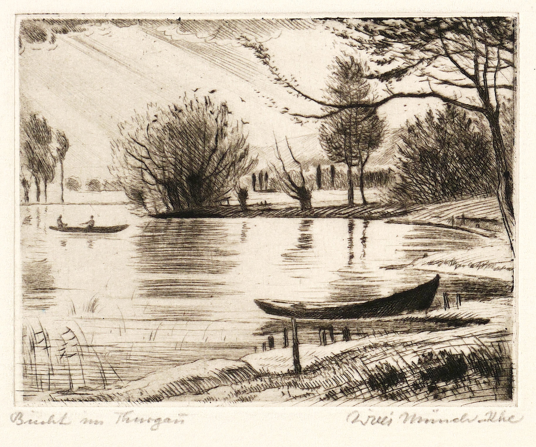 1920-1925. Radierung / Strichätzung & Kaltnadel, in Schwarz, auf hellem Büttenkarton. – Originale Künstlergrafik, von Willi Münch-Khe. – 7,3 x 9,5 cm (Darstellung / Platte), 19 x 21 cm (Blatt).