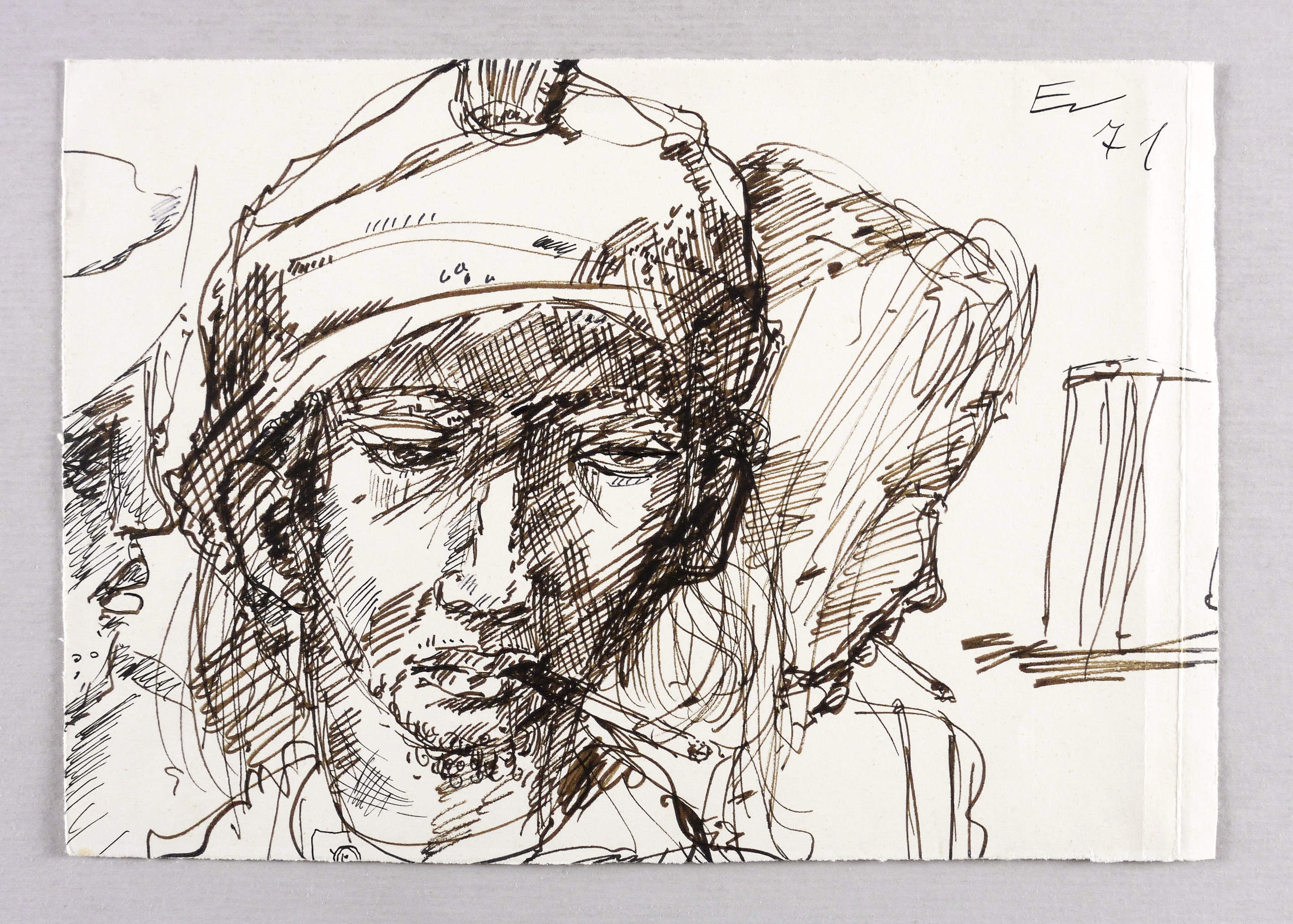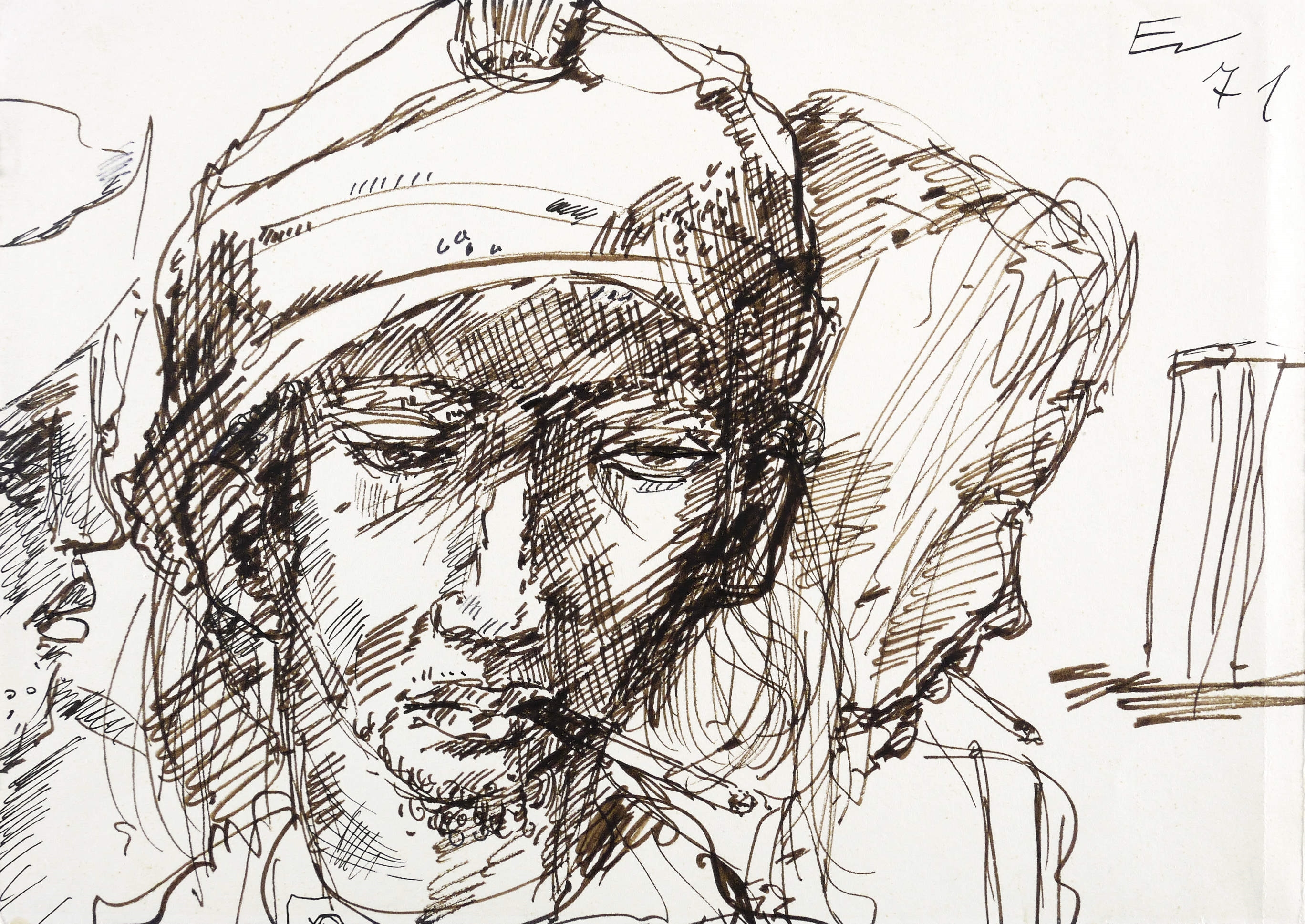 1971. Zeichnung / Faserstift, in Braun & Schwarz, auf weißem Velin. – Originale Künstlergrafik, von Eva Schwimmer. – Unikat. – 15,8 x 22,6 cm (Darstellung / Blatt).