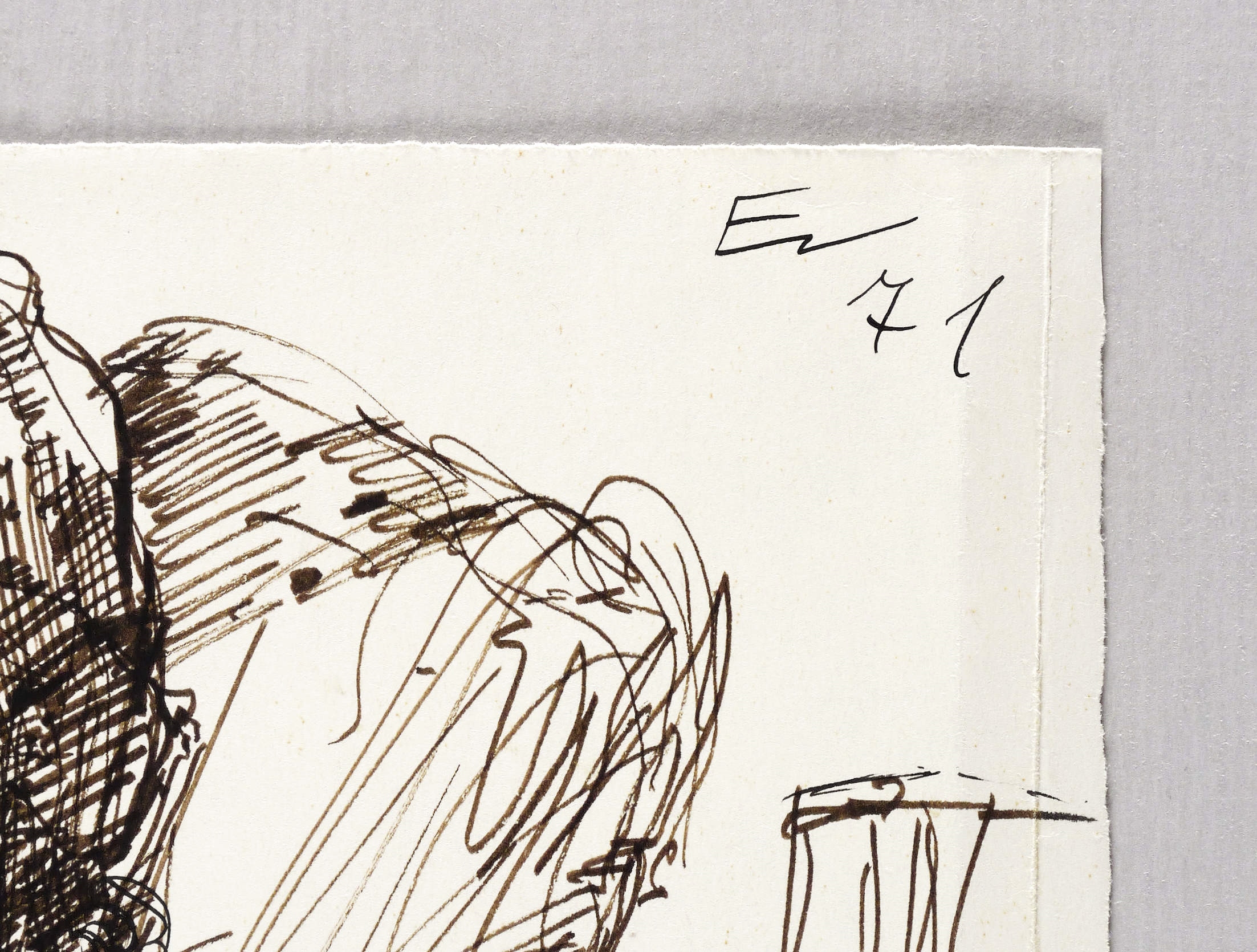 Rechts oben in schwarzer Feder monogrammiert und datiert: ″ES 71″. Verso nochmals in Feder signiert: ″Eva Schwimmer″. Dazu maschinenschriftlich Widmung: ″Geschenk für Frau Dr. Magdalena George″. – Provenienz: Nachlass der Kunstwissenschaftlerin Magdalena George, Leipzig, Autorin einer Max-Schwimmer- Monografie und des Werkverzeichnisses der Druckgrafik von Max Schwimmer. – Originale Vertikalfalte im rechten Rand. Guter Zustand.