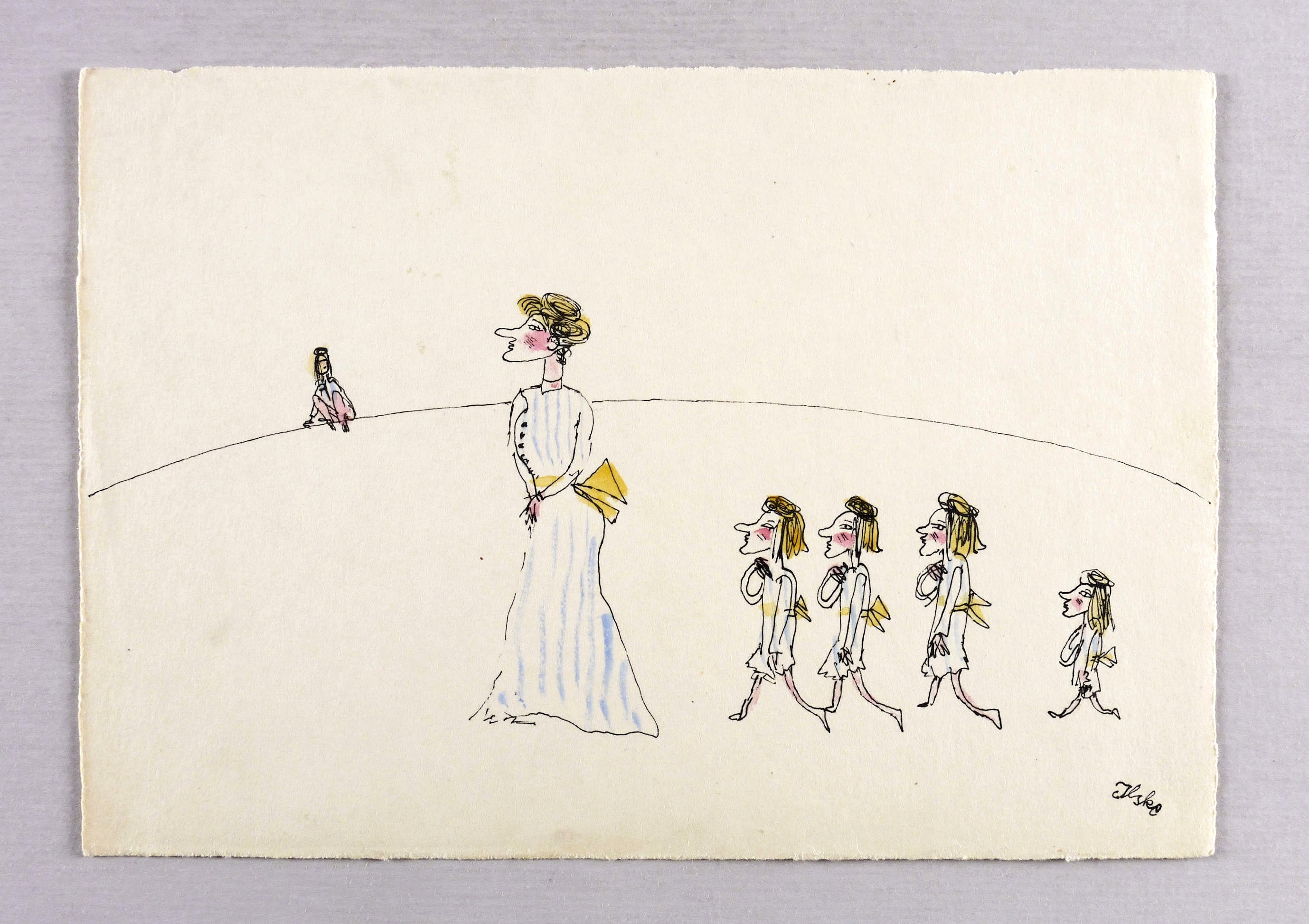 Rechts unten in schwarzer Feder signiert: ″Ilske″. – Am Horizont ein ″böses″ bzw. ″aus der Art gefallenes″ Mädchen, vor dessen Augen eine strenge Gouvernante mit vier braven Mädchen im Gänsemarsch vorüberzieht. – Sehr guter Zustand.