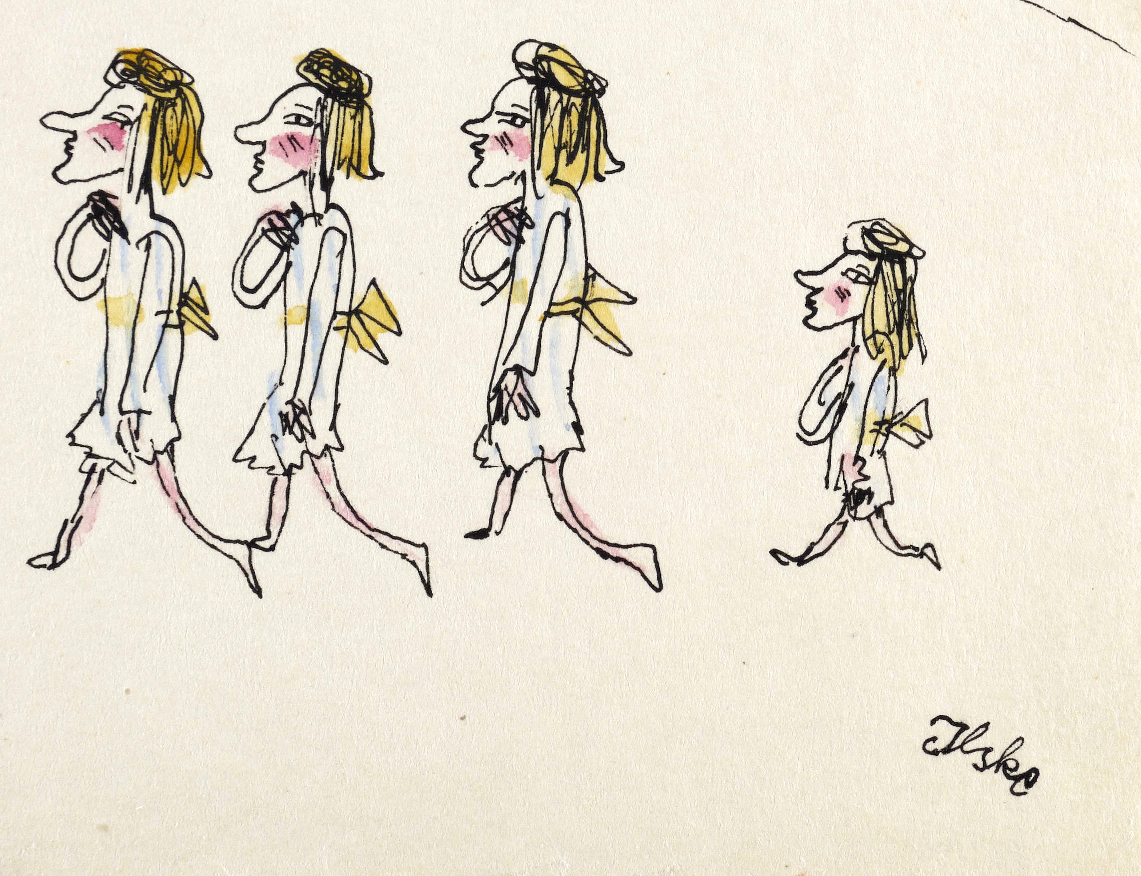 1950-1960. Zeichnung / Feder, in schwarzer Tusche, aquarelliert, auf chamois Velin. – Originale Künstlergrafik, von Ilske Schwimmer. – Unikat. – 15,5 x 22,0 cm (Darstellung / Blatt).