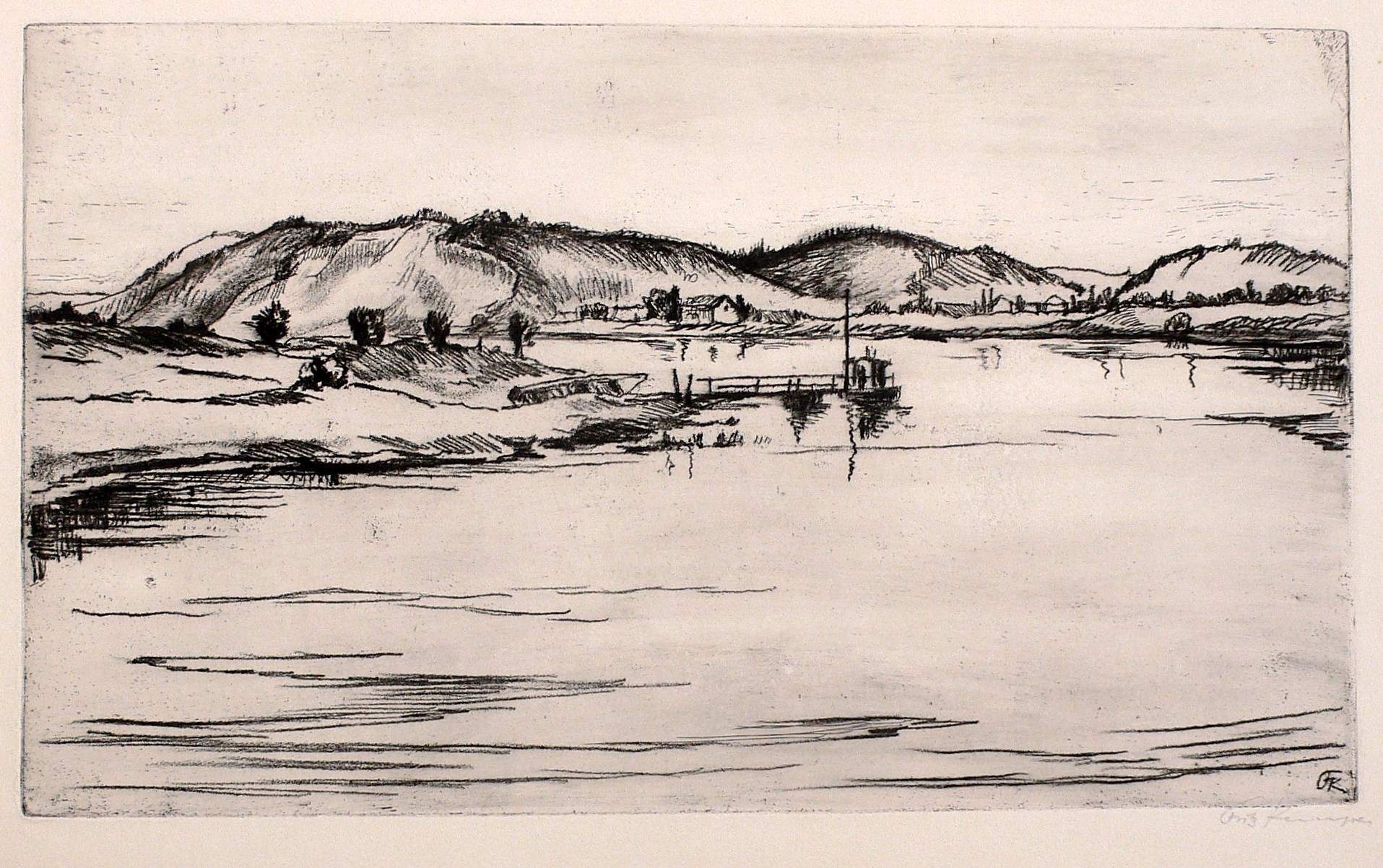 1952-1959. Radierung / Vernis mou, in Schwarz, auf hellchamois Bütten. – Originale Künstlergrafik, von Fritz Kempe. – 25,0 x 42,5 cm (Darstellung / Platte), 34 x 48,5 cm (Blatt).