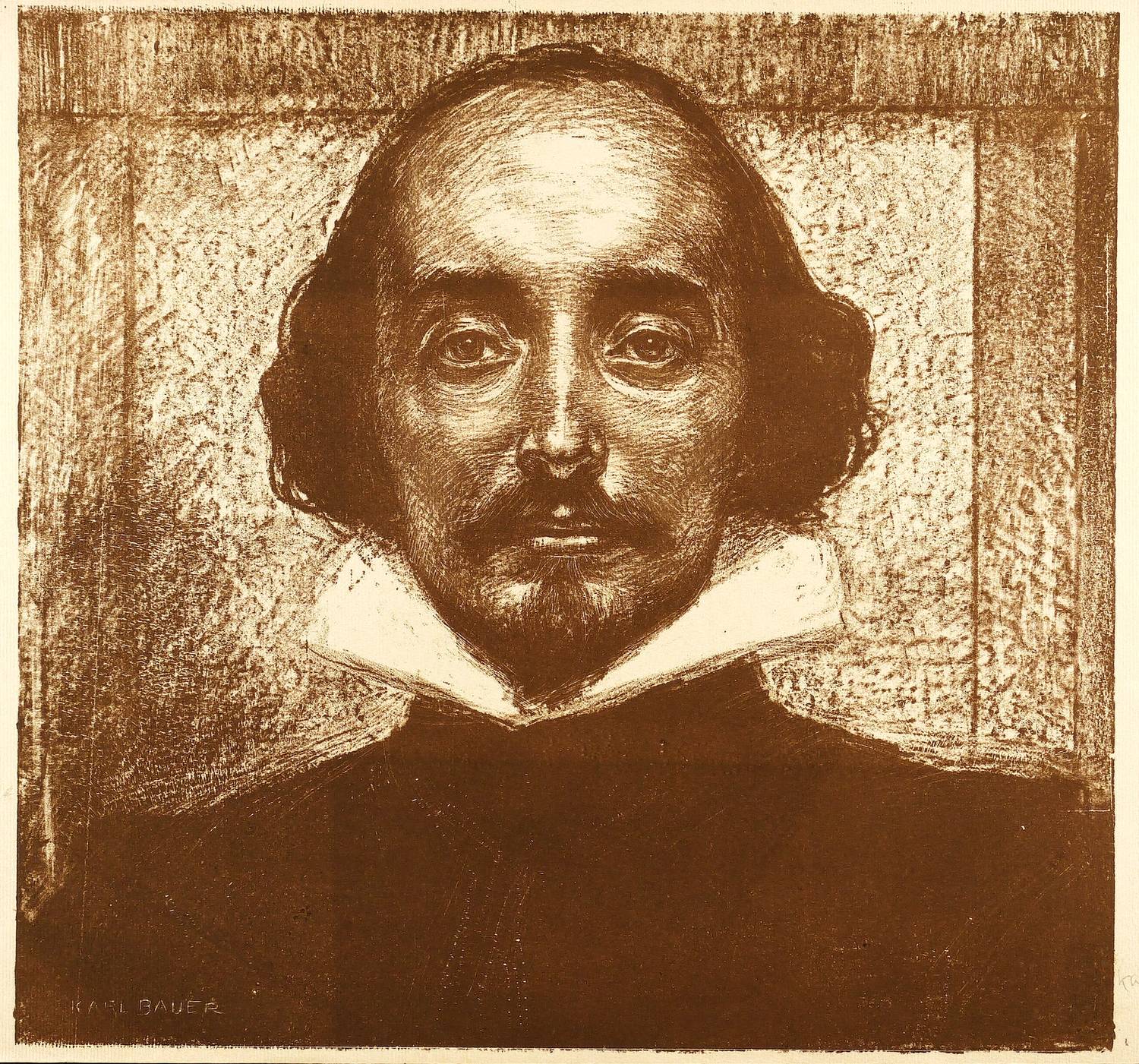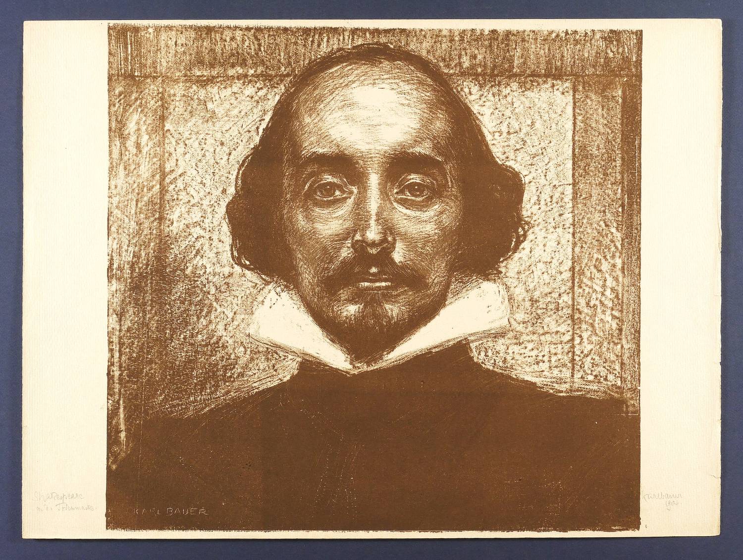 Rechts unten in Bleistift signiert und datiert: ″Karl Bauer / 1904″. Rechts Titel: ″Shakespeare / n.d. Todenmaske.″ Im Stein links unten Ritzsignatur: ″KARL BAUER″. Verso Stempel der Kunstdruckerei Künstlerbund Karlsruhe (KKK) mit handschriftlicher Katalognummer ″16″. – Ecken etwas bestoßen. Im Blattrand rechts unten marginaler kleiner Einriss. Insgesamt gut erhalten.