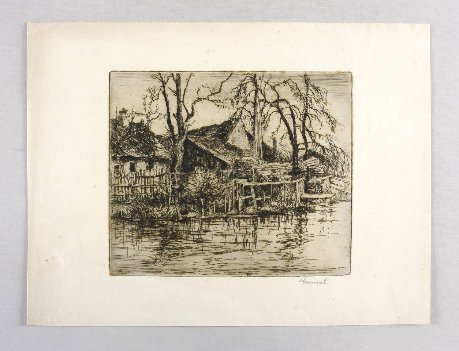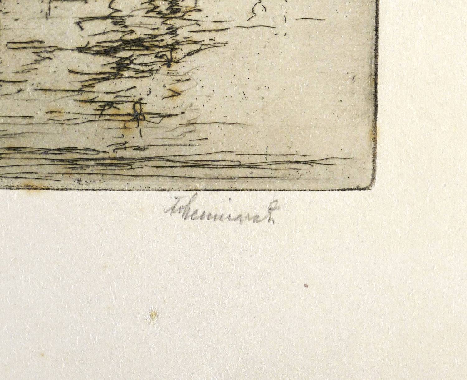 Um 1910. Radierung / Strichätzung, in Schwarzbraun, mit Plattenton, auf gelbem Velin. – Originale Künstlergrafik, von Fritz von Hellingrath. – 15,2 x 17,8 cm (Darstellung / Platte), 23 x 30 cm (Blatt).