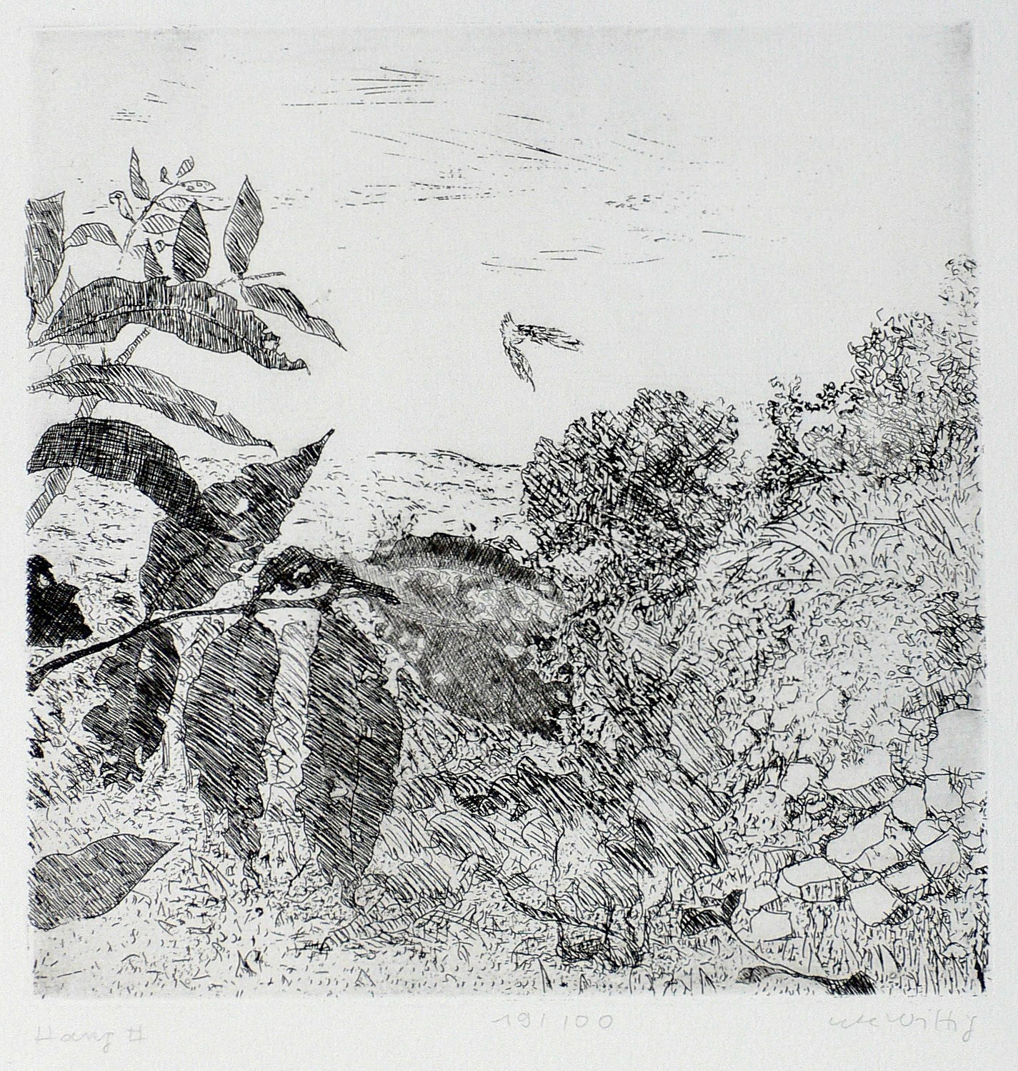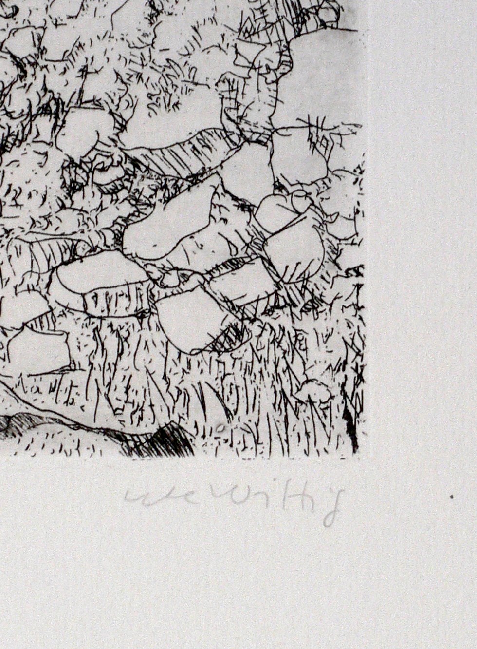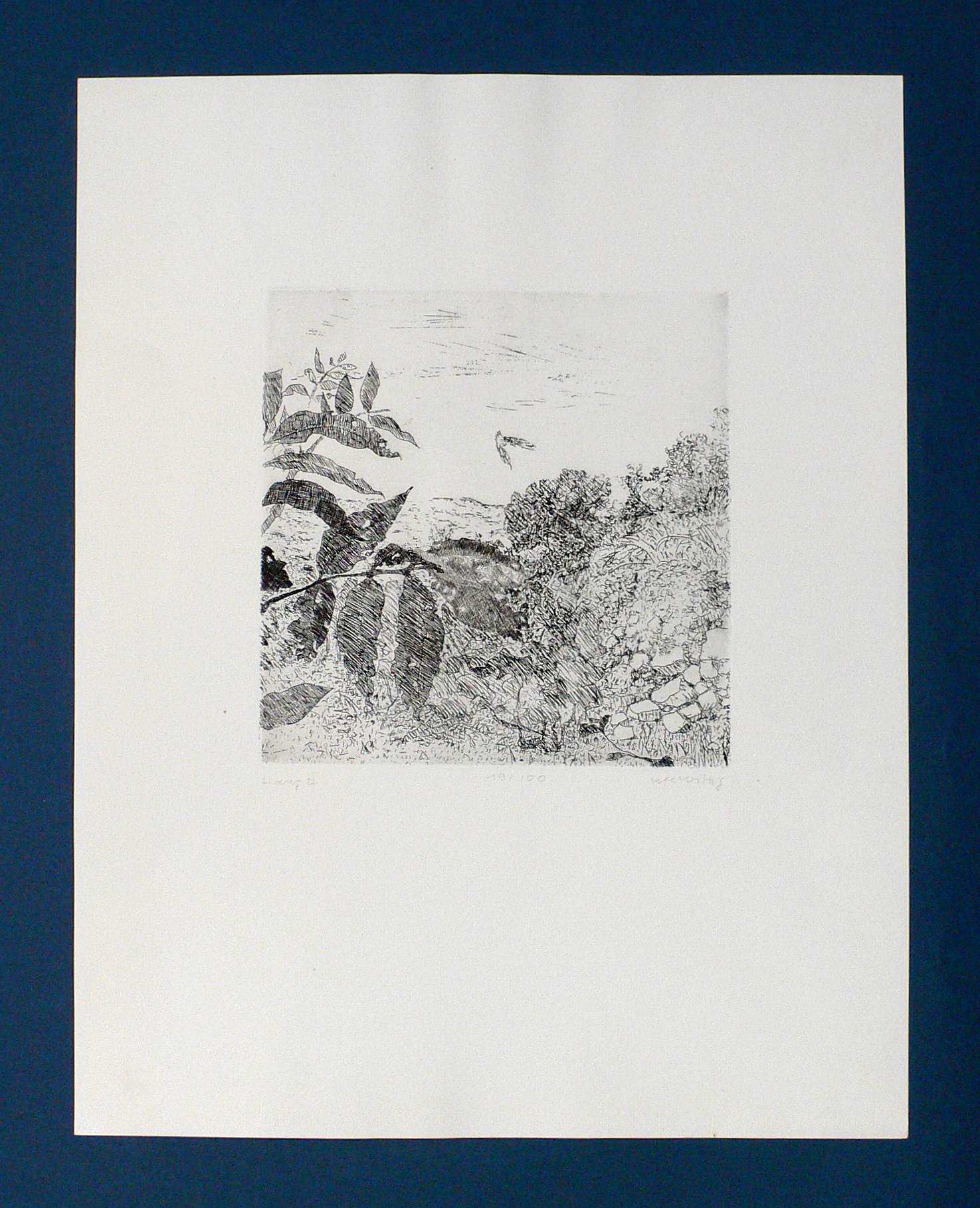 Um 1975. Radierung / Strichätzung, in Schwarz, mit Plattenton, auf hellem Velin. – Originale Künstlergrafik, von Ute Wittig. – Auflage Exemplar Nr. 19/100. – 19,5 x 19,5 cm (Darstellung / Platte), 45 x 35 cm (Blatt).