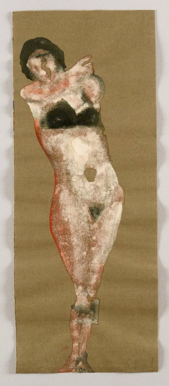 Um 1995. Zeichnung / Mischtechnik, auf dunkel getöntem Ingres-Bütten. – Originale Künstlergrafik, von Reinhard Stangl. – Unikat. – 49,4 x 15,5 cm (Darstellung / Blatt).
