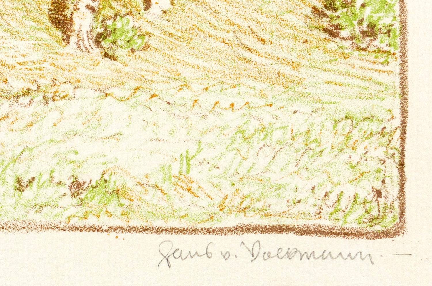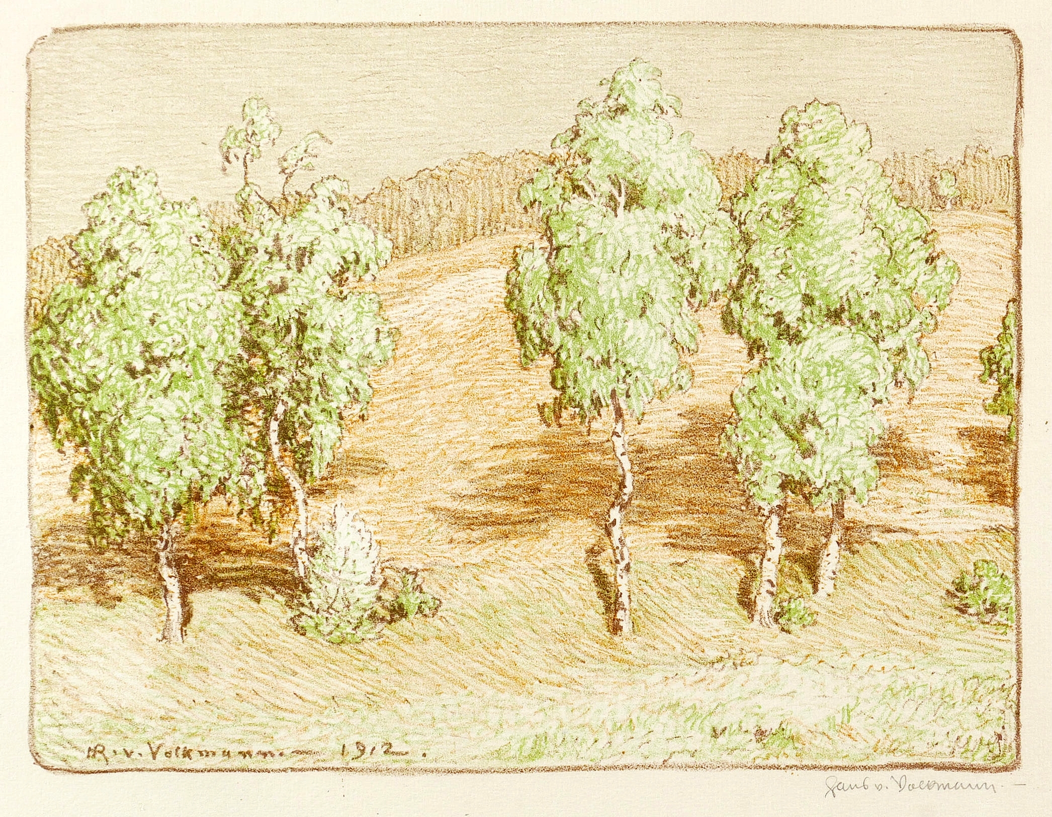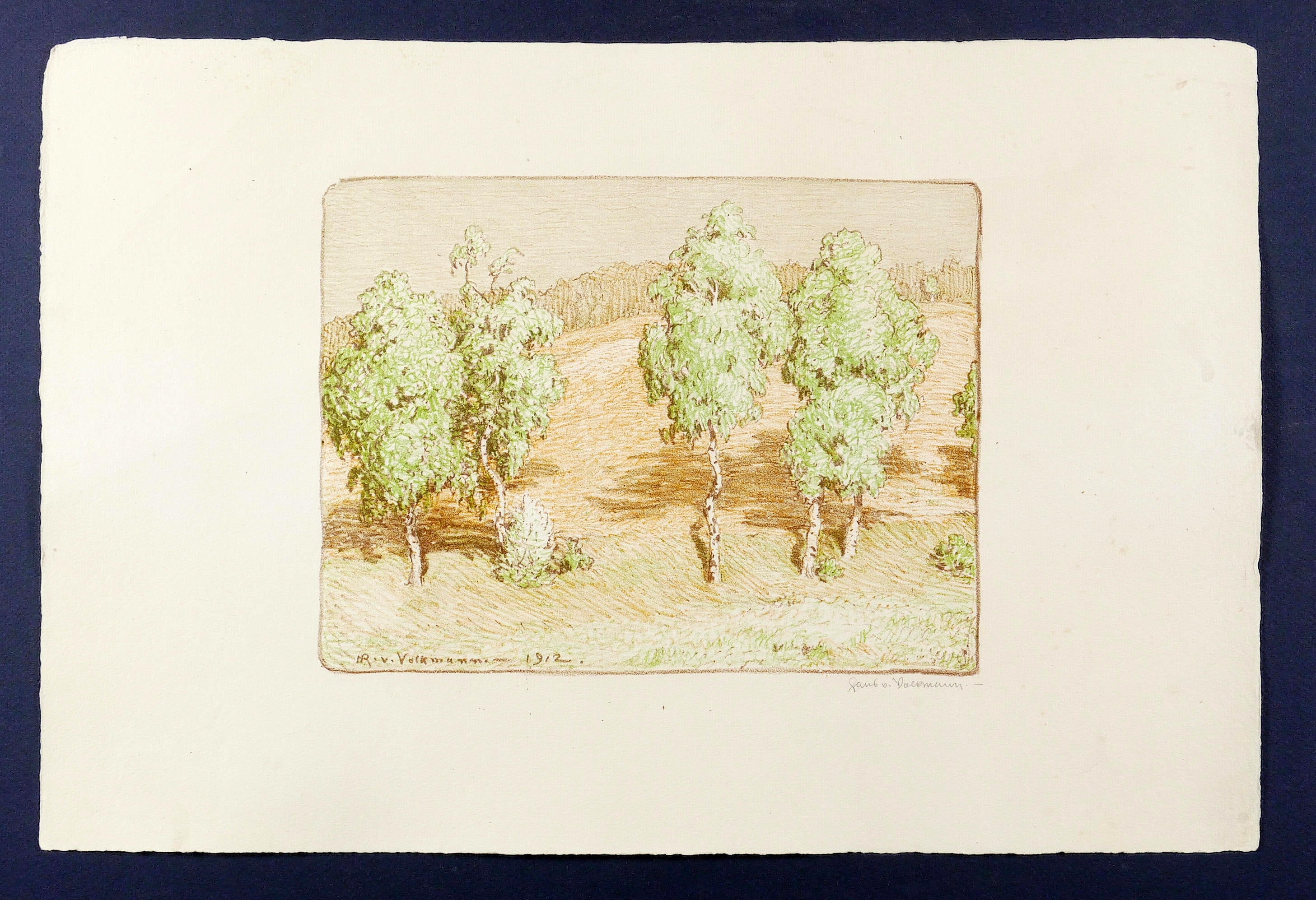 Rechts unten in Bleistift signiert: ″Hans v. Volkmann″. Im Stein links unten Signatur und Jahr: ″HR. v. Volkmann - 1912.″ – Vgl. das Ölgemälde ″Abendliche Sommerlandschaft mit Birken″ von 1911 (Van Ham, 222. Auktion Alte Kunst, Los 1746). – Im breiten Rand minimal fleckig, Insgesamt gut erhalten.