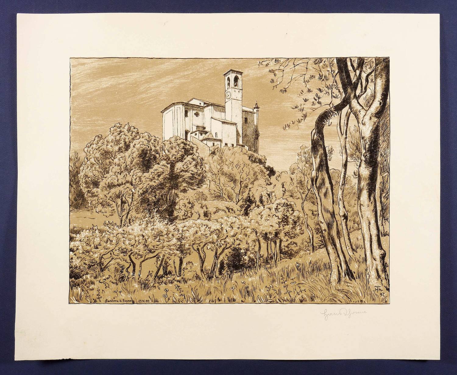 Beringer 85. – Rechts unten in Bleistift signiert: ″Hans Thoma″. Im Stein rechts unten Monogramm und Jahr: ″HTh / 97″. Links Titel und Datum: ″Gardone di Sopra 17.IV.97.″ – Schönes breitrandiges Exemplar. Kontrastreiche und farbfrische Wirkung. Oben restaurierter Randriss weit außerhalb der Darstellung. Insgesamt sehr guter Zustand.