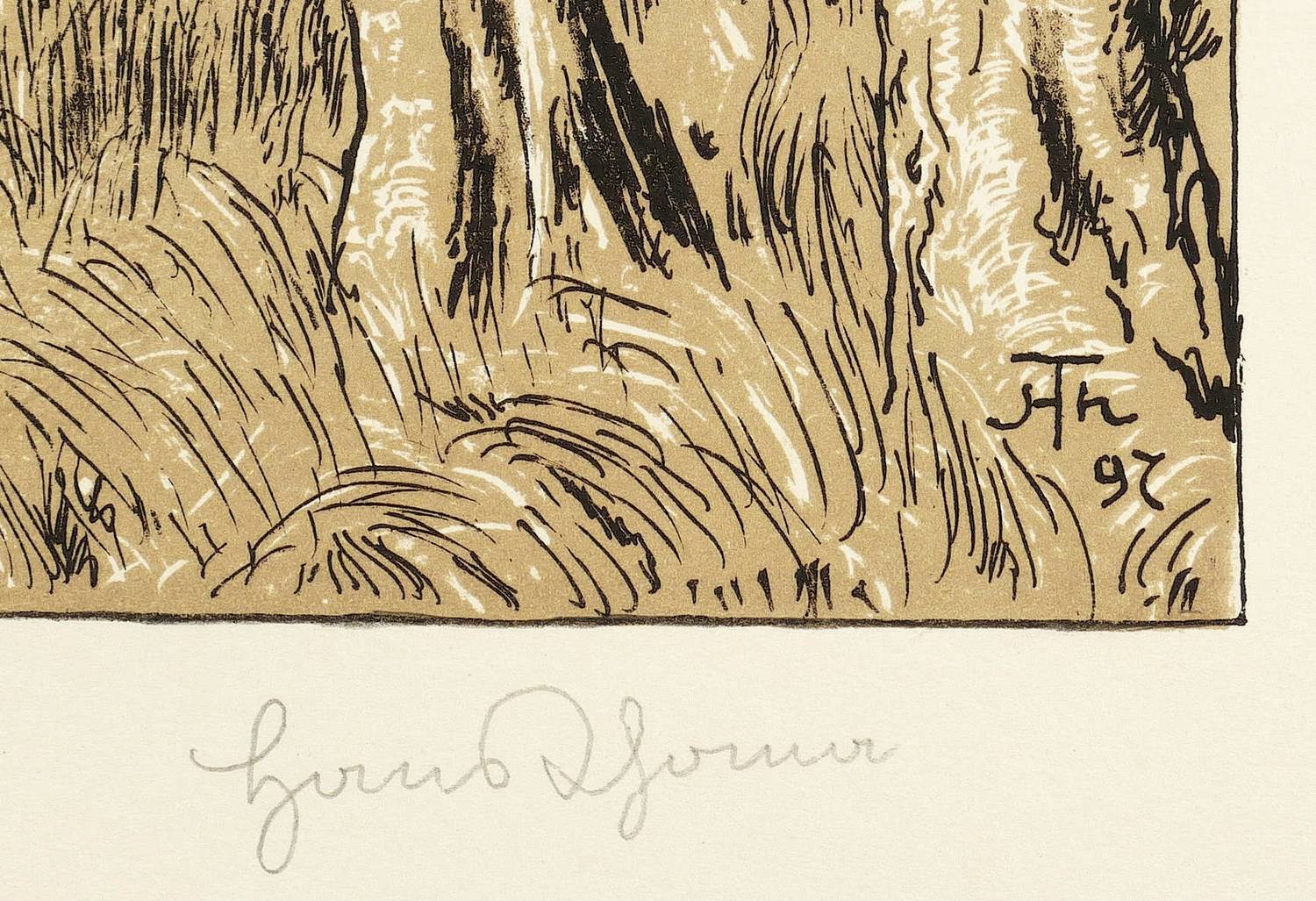 1897. Farblithografie / Feder- & Pinsellithografie, in Ocker & Schwarz, auf hellem Büttenkarton. – Originale Künstlergrafik, von Hans Thoma. – 35,5 x 46,2 cm (Darstellung / Druckbild), 50 x 61 cm (Blatt).