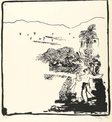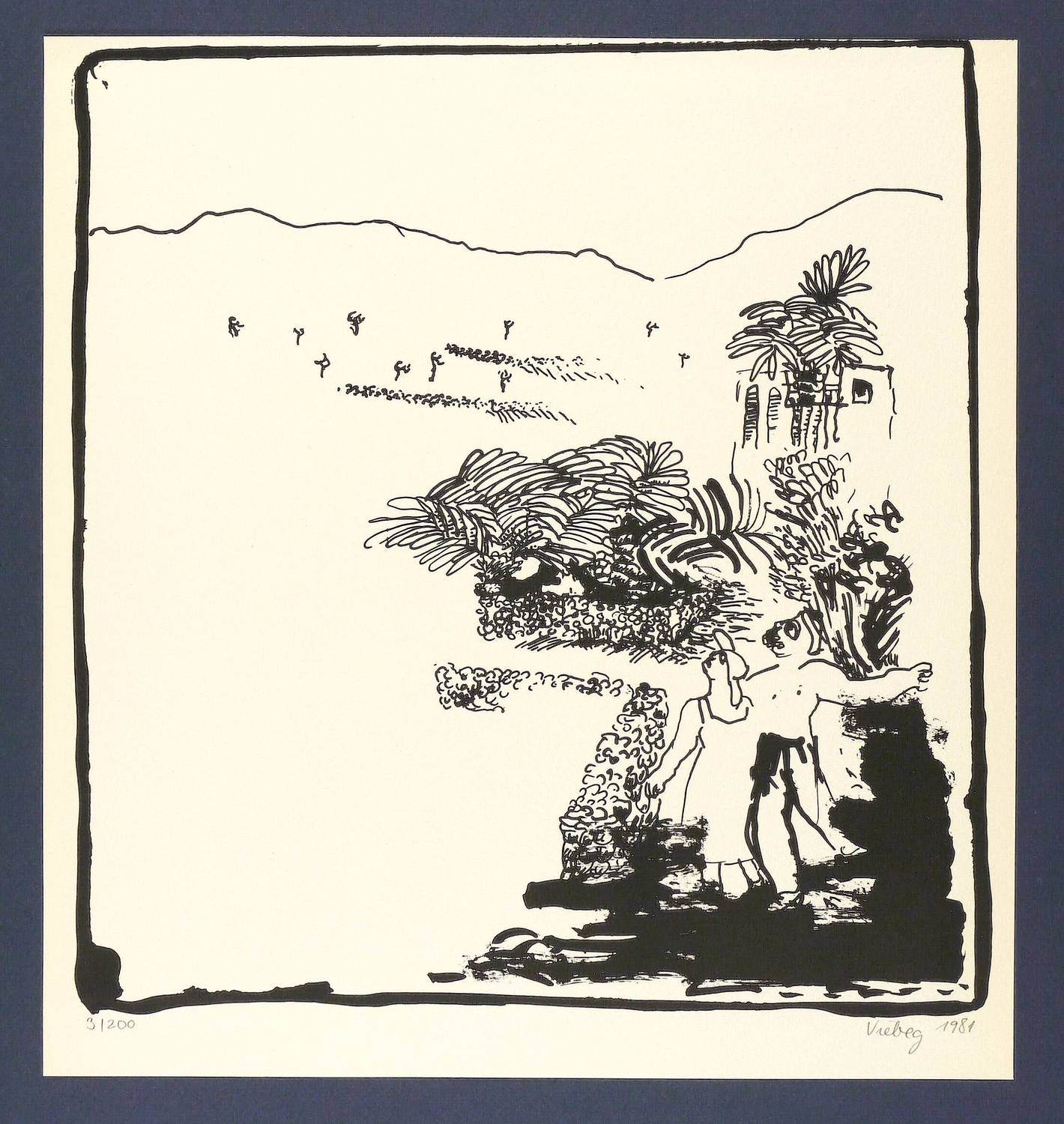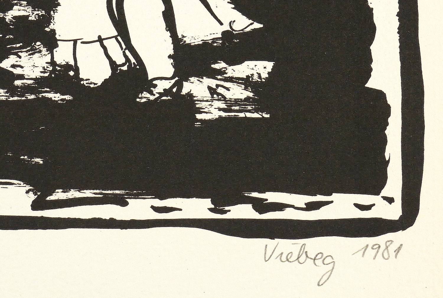 1981. Lithografie / Pinsellithografie, in Schwarz, auf Büttenkarton. – Originale Künstlergrafik, von Eva-Maria Viebeg. – Auflage Exemplar Nr. 3/200. – 33,5 x 32,30 cm (Darstellung), 36,5 x 34 cm (Blatt).