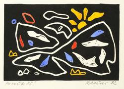 1982. Linolschnitt / Weißlinienschnitt, in Schwarz, aquarelliert, auf weißem Papier. – Originale Künstlergrafik, von Helmut Kleiser. – 8,2 x 12,3 cm (Darstellung / Druckbild), 21 x 15 cm (Blatt).