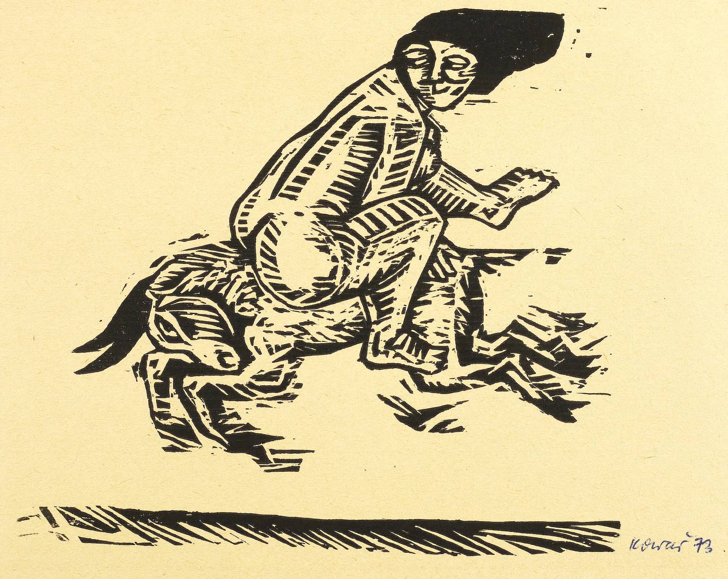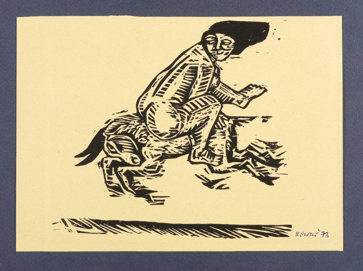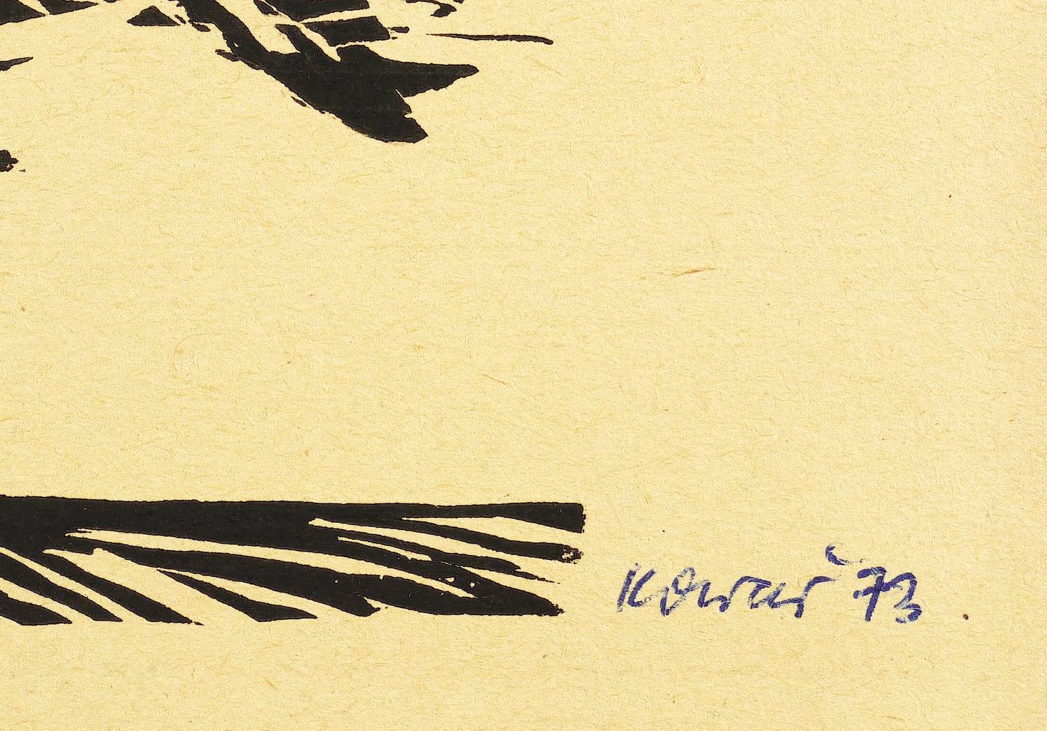 1973. Holzschnitt, in Schwarz, auf gelblich-orangem Papier. – Originale Künstlergrafik, von Thea Kowar. – 14,0 x 15,5 cm (Darstellung), 15 x 21 cm (Blatt).