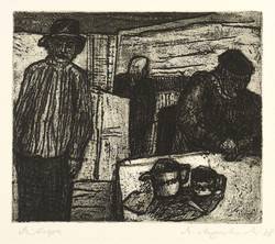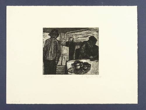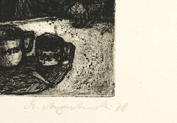 1978. Radierung / Vernis mou, in Schwarz, auf hellgelbem Maschinenbütten. – Originale Künstlergrafik, von Michael Augustinski. – Probedruck. – 12,1 x 14,3 cm (Darstellung / Platte), 25 x 34 cm (Blatt).
