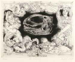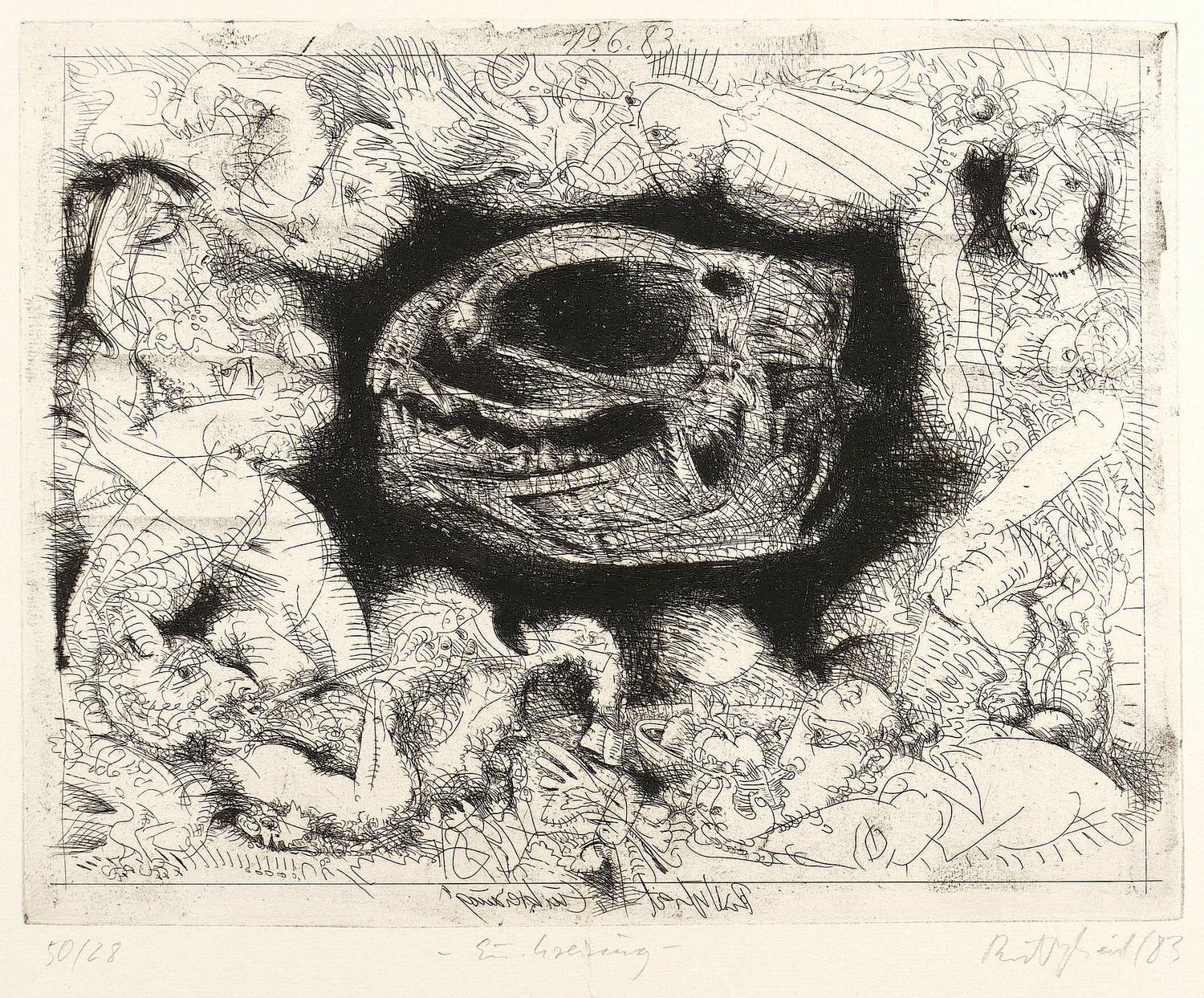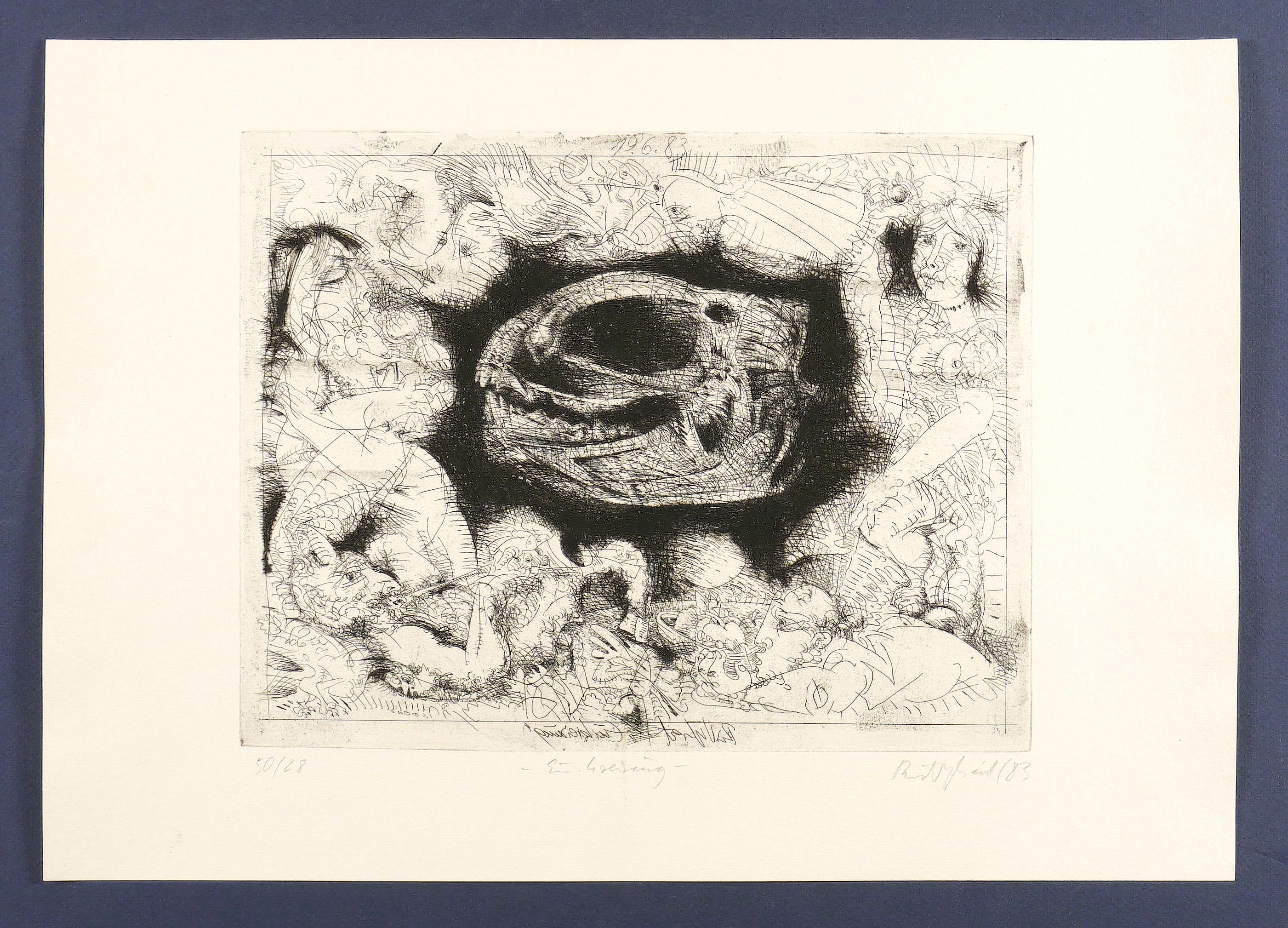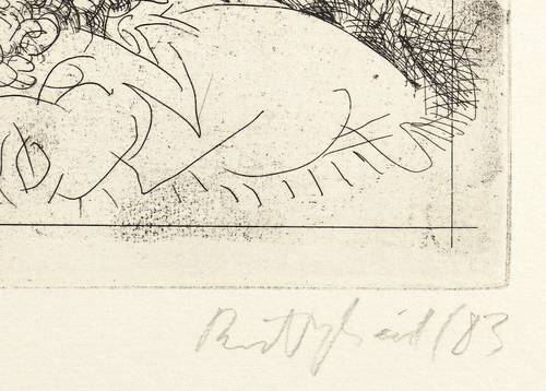 1983. Radierung / Strichätzung, in Schwarz, auf hellgelbem Papier. – Originale Künstlergrafik, von Frank Ruddigkeit. – Auflage Exemplar Nr. 28/50. – 24,9 x 31,8 cm (Darstellung / Platte), 34 x 48 cm (Blatt).