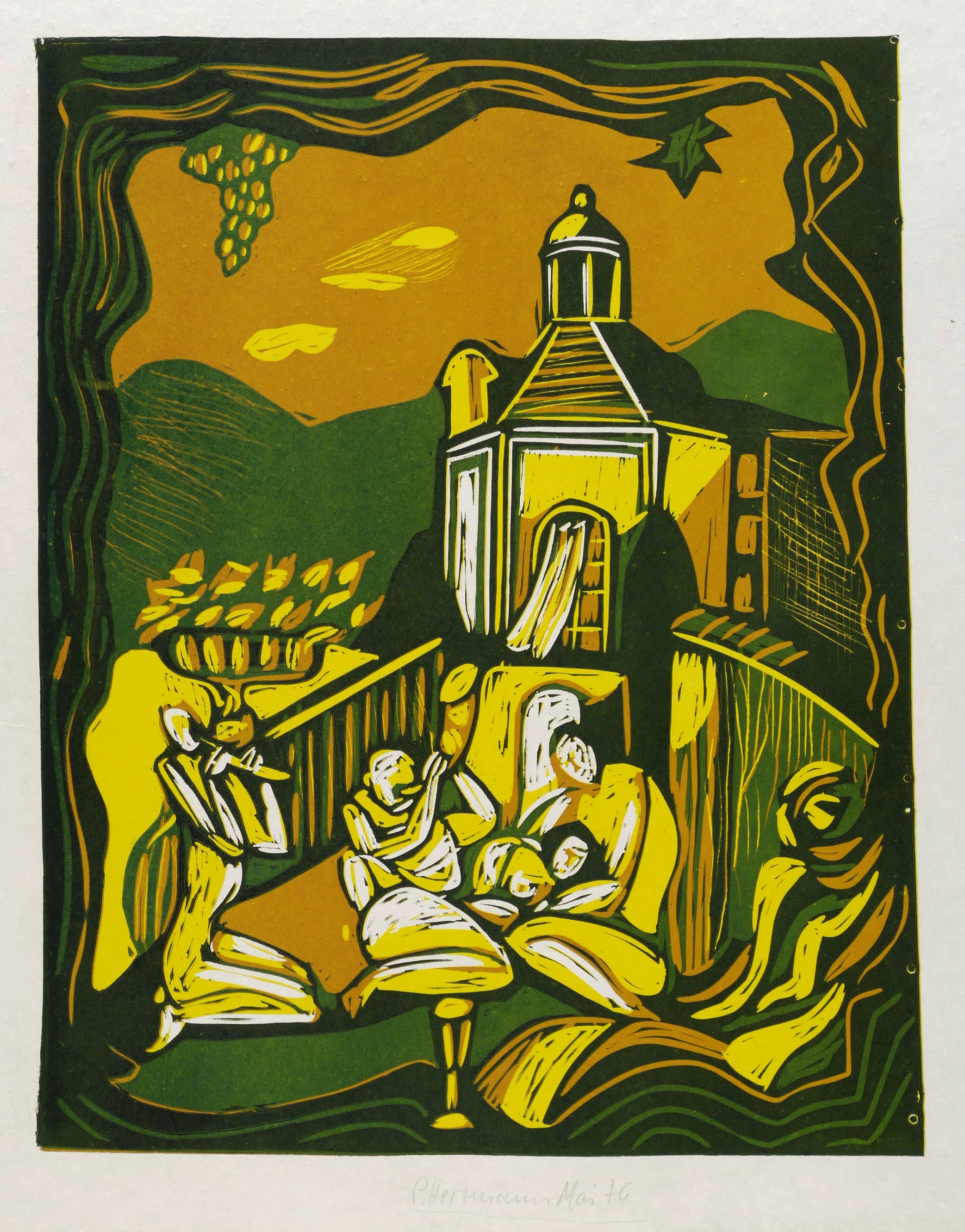 1976. Farbholzschnitt, in 4 Farben, auf weichem rauem Velinkarton. – Originale Künstlergrafik, von Peter Herrmann. – Probedruck. – 51,9 x 40,5 cm (Darstellung / Druckstock), 60 x 50 cm (Blatt).