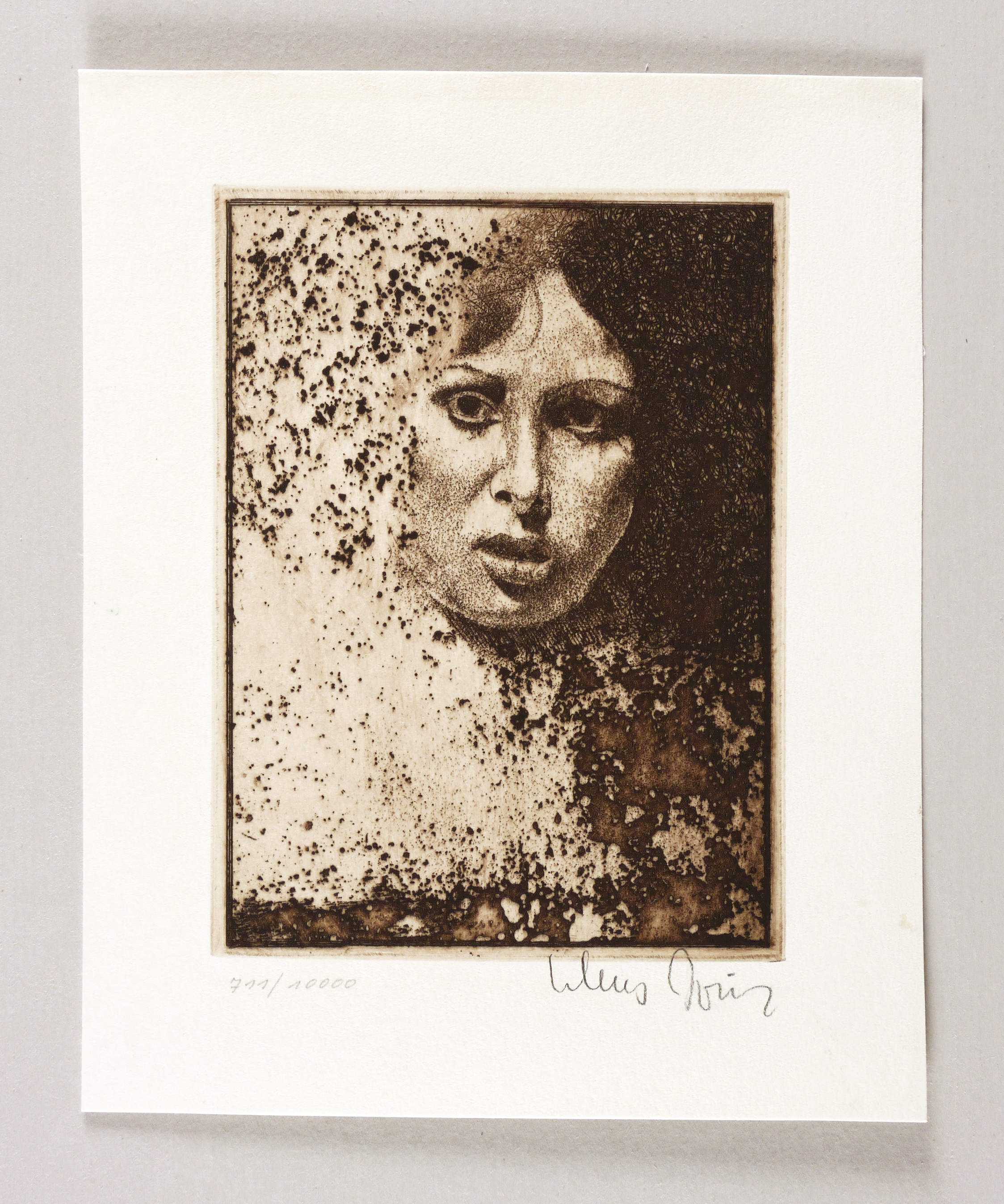 1978. Radierung / Strichätzung, Reservage & Punzenstich, mit Plattenton, in Rotbraun, auf Velinkarton. – Von Klaus Böttger. – Auflage Exemplar Nr. 711/10000. – 13,3 x 9,9 cm (Darstellung / Platte), 18 x 15 cm (Blatt).