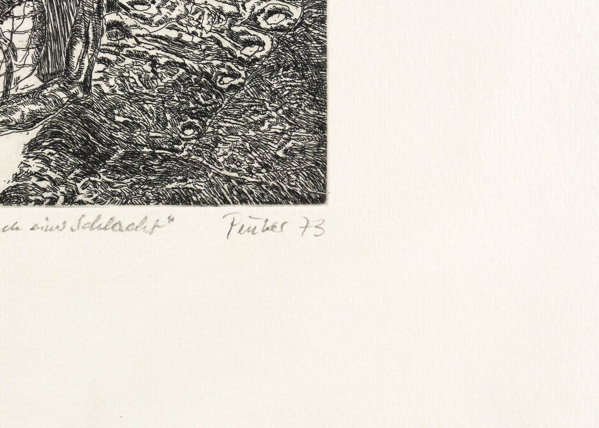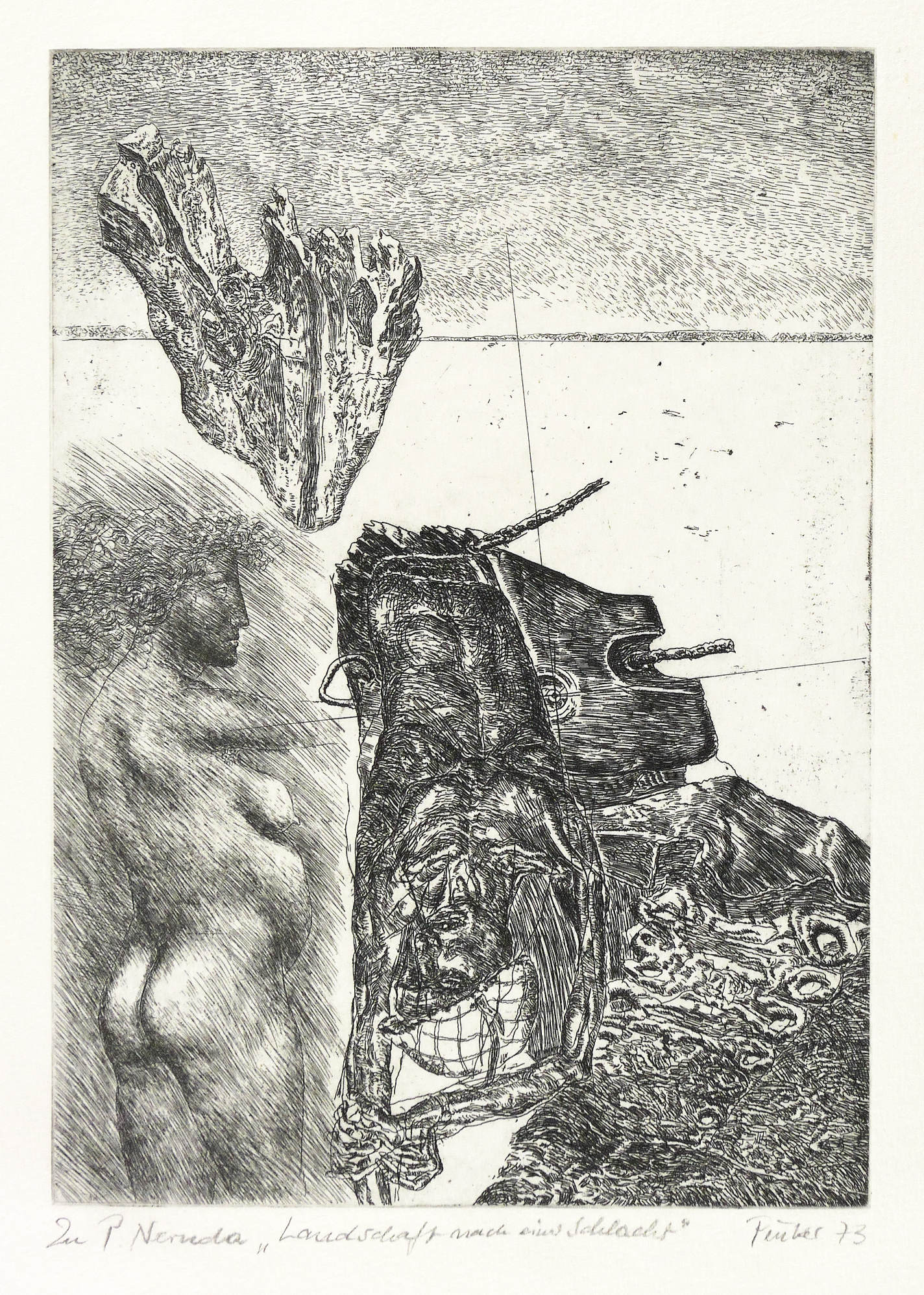 Rechts unten in Bleistift signiert und datiert: ″Peuker 73″. Links eigenhändiger Titel: ″Zu P. Neruda 'Landschaft nach einer Schlacht'″. – Oberer Rand unmerklich wellig. Ohne Mängel. Sehr guter Erhaltungszustand.