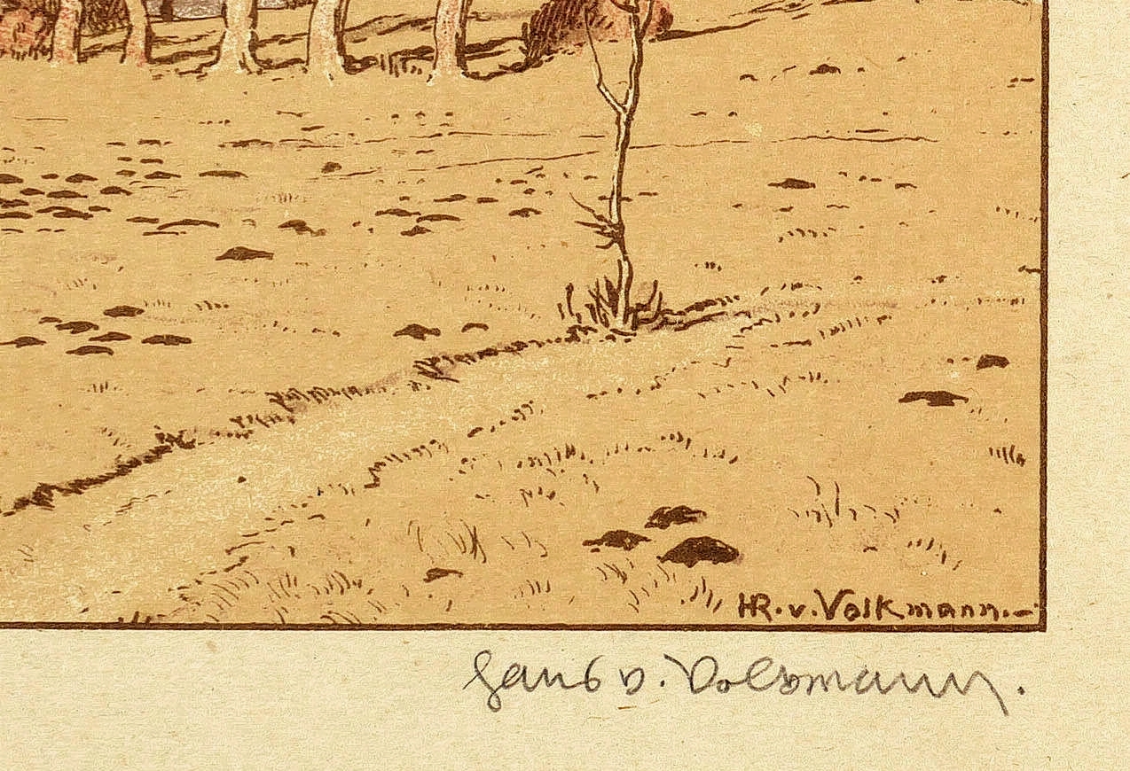 Hans Richard von Volkmann (1860 Halle/Saale - 1927 Halle/Saale). Deutscher Landschaftsmaler und Grafiker. Mitglied der Schwälmer Willingshäuser Malerkolonie. 1880-88 Studium an der Akademie in Düsseldorf. 1892 als Meisterschüler von Gustav Schönleber dem Älteren 1892 an der Kunstschule in Karlsruhe. Entwickelte sich dort zum bedeutendsten Vertreter der sogenannten Karlsruher Landschaftsschule. Seine Farblithografien und Radierungen gehören neben denen von Hans Thoma zum Besten, was diese Schule hervorbrachte.