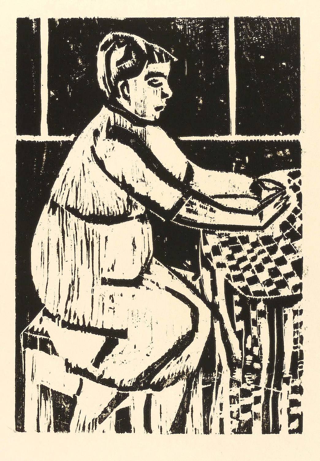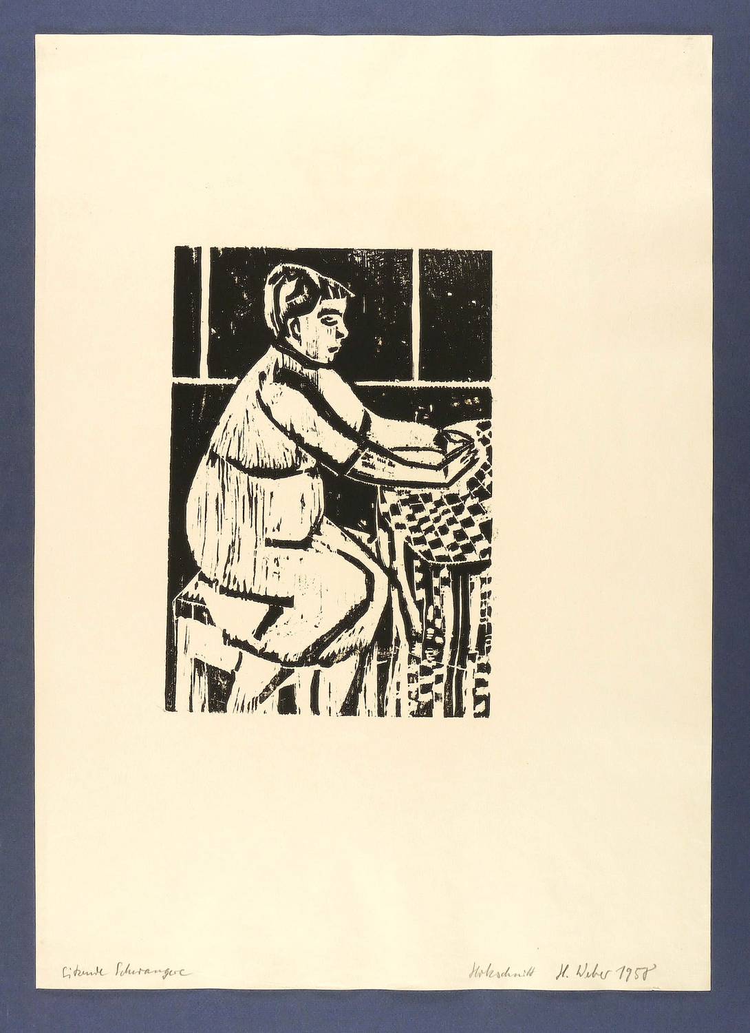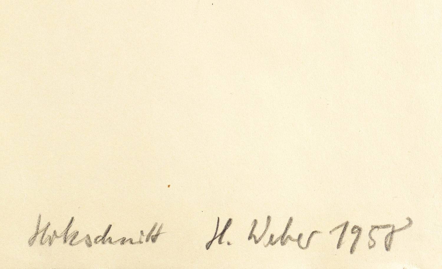 1958. Holzschnitt, in Schwarz, auf leichtem gelblichem Maschinenpapier. – Originale Künstlergrafik, von Horst Weber. – 29,1 x 19,9 cm (Darstellung / Druckstock), 60 x 42 cm (Blatt).