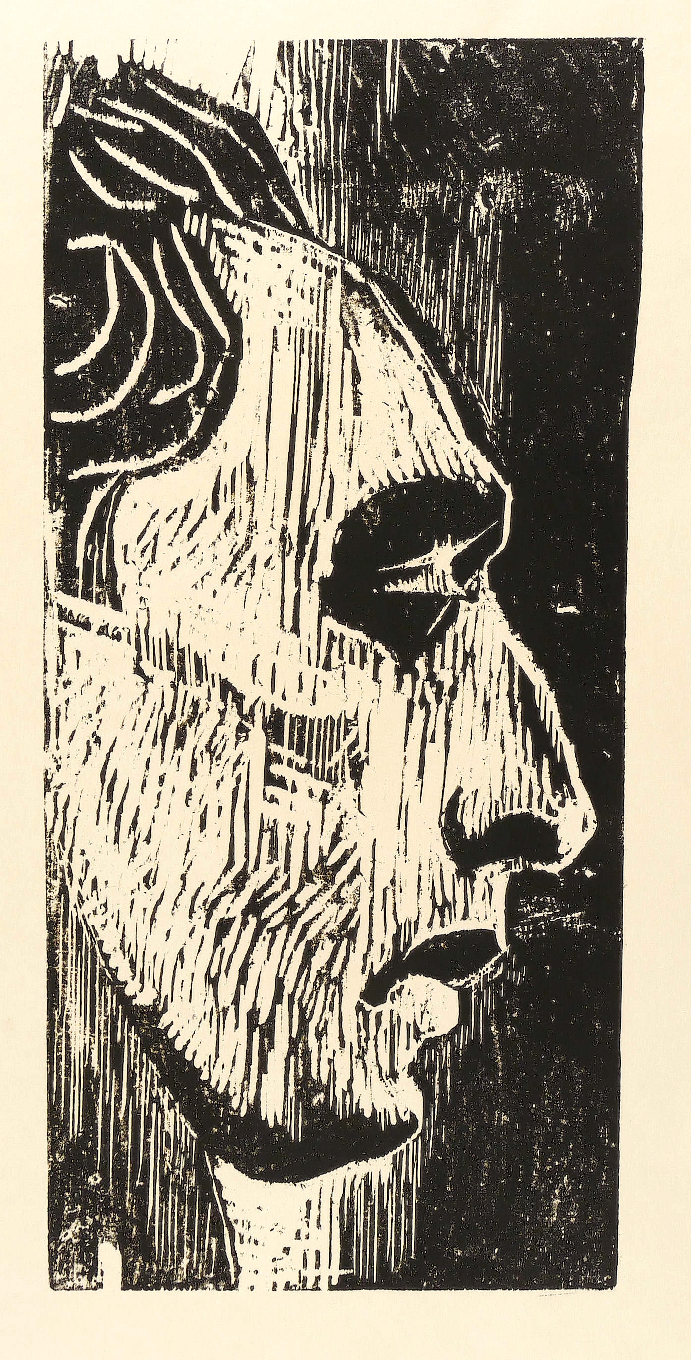 1958. Holzschnitt, in Schwarz, auf leichtem gelblichem Maschinenpapier. – Originale Künstlergrafik, von Horst Weber. – 42,8 x 20,5 cm (Darstellung / Druckstock), 60 x 42 cm (Blatt).