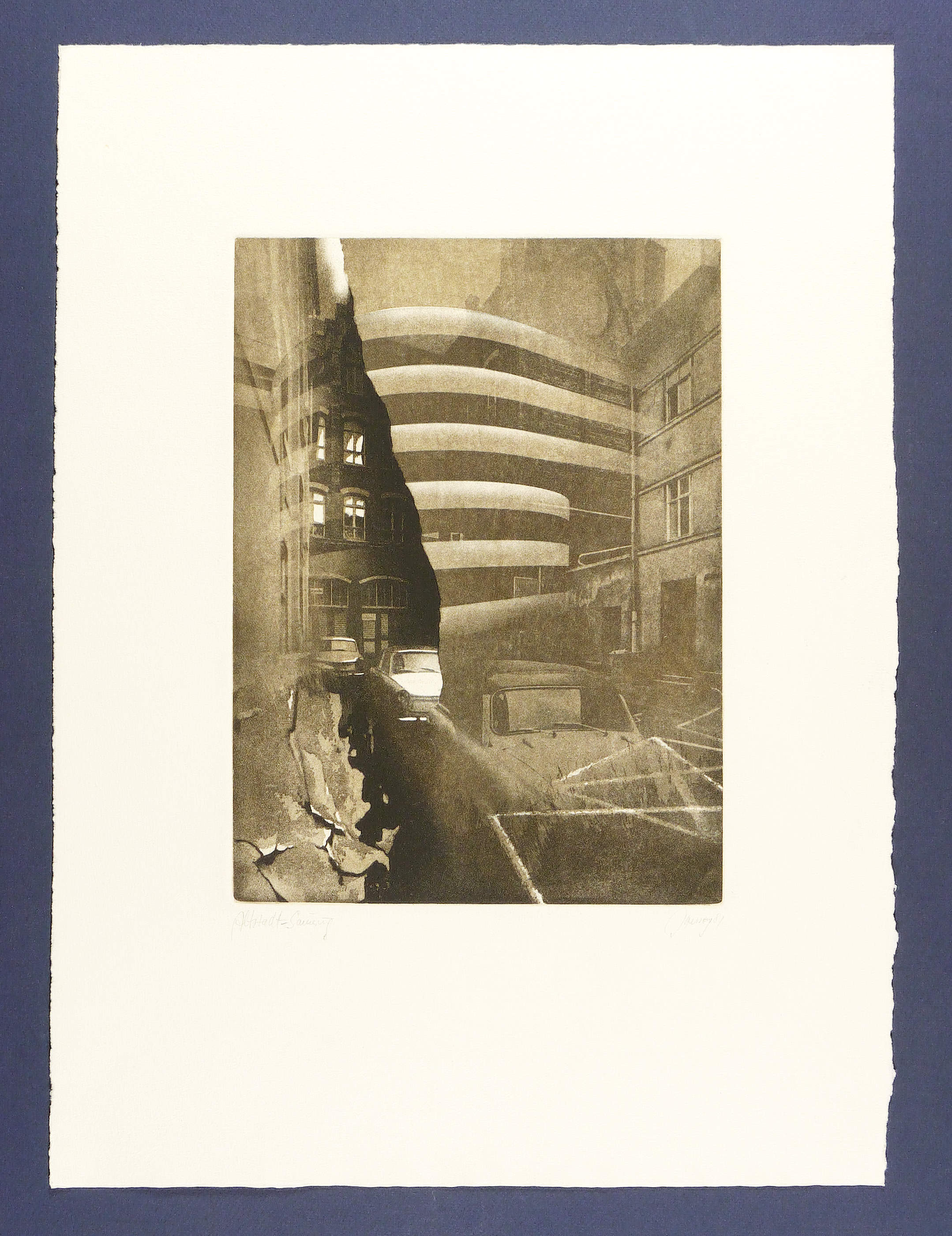 Rechts unten in Bleistift signiert und datiert. Links Titel. – Radierkünstlerische Montage fotografischer Aufnahmen einer verfallenen Altstadt (wohl Ost-Berlin), parkenden Autos (Trabant) und einer modernen Architektur. – Sehr gut erhalten.