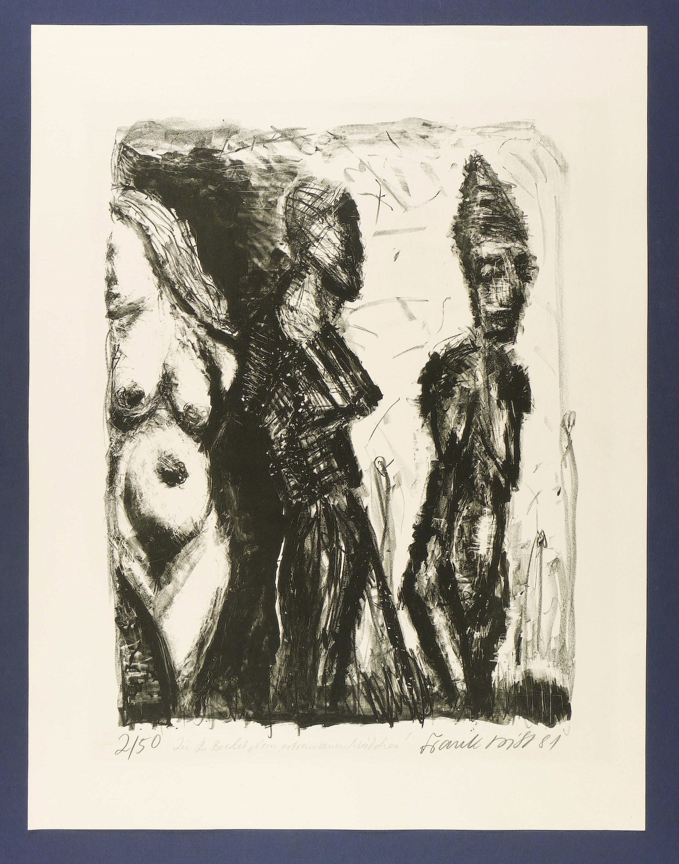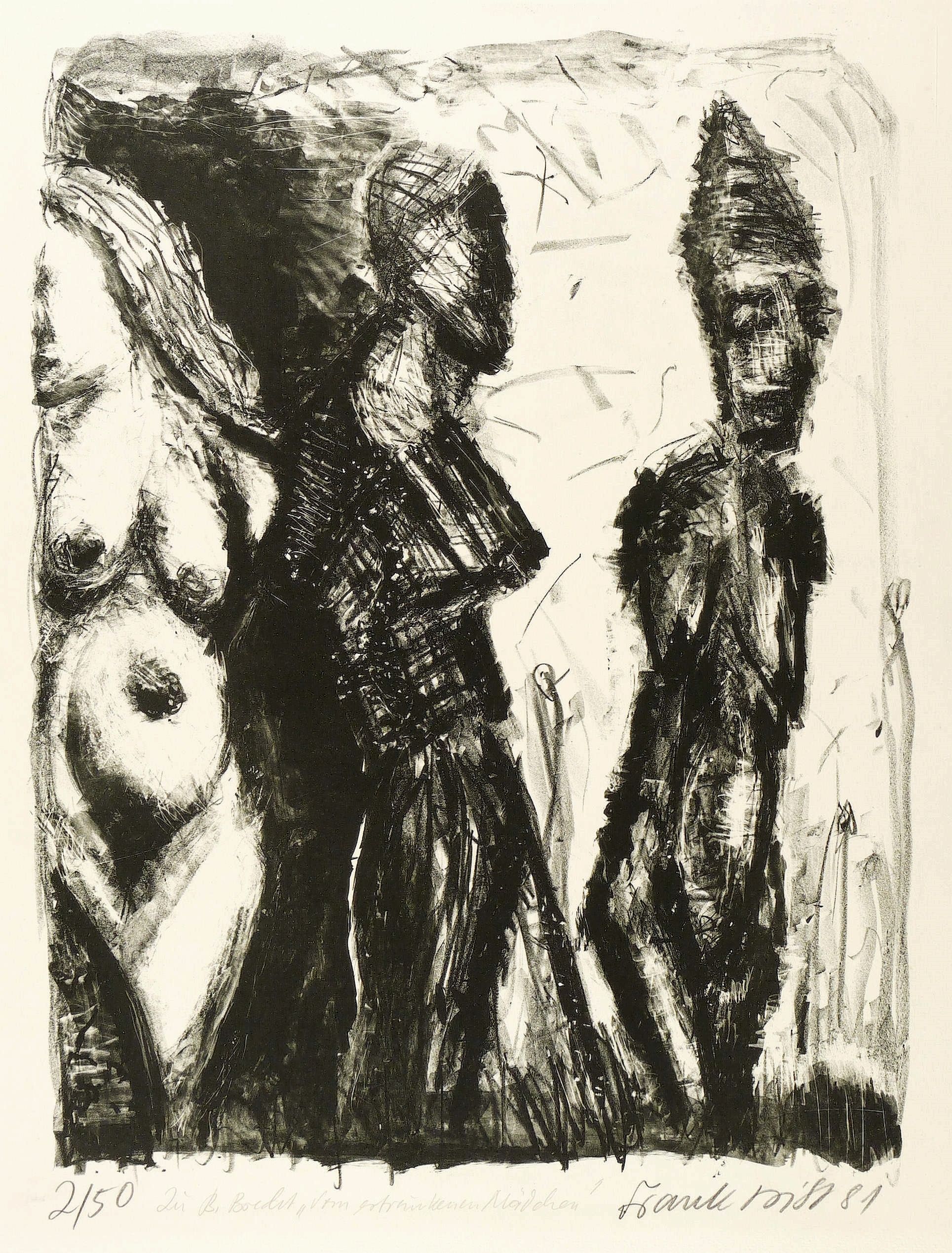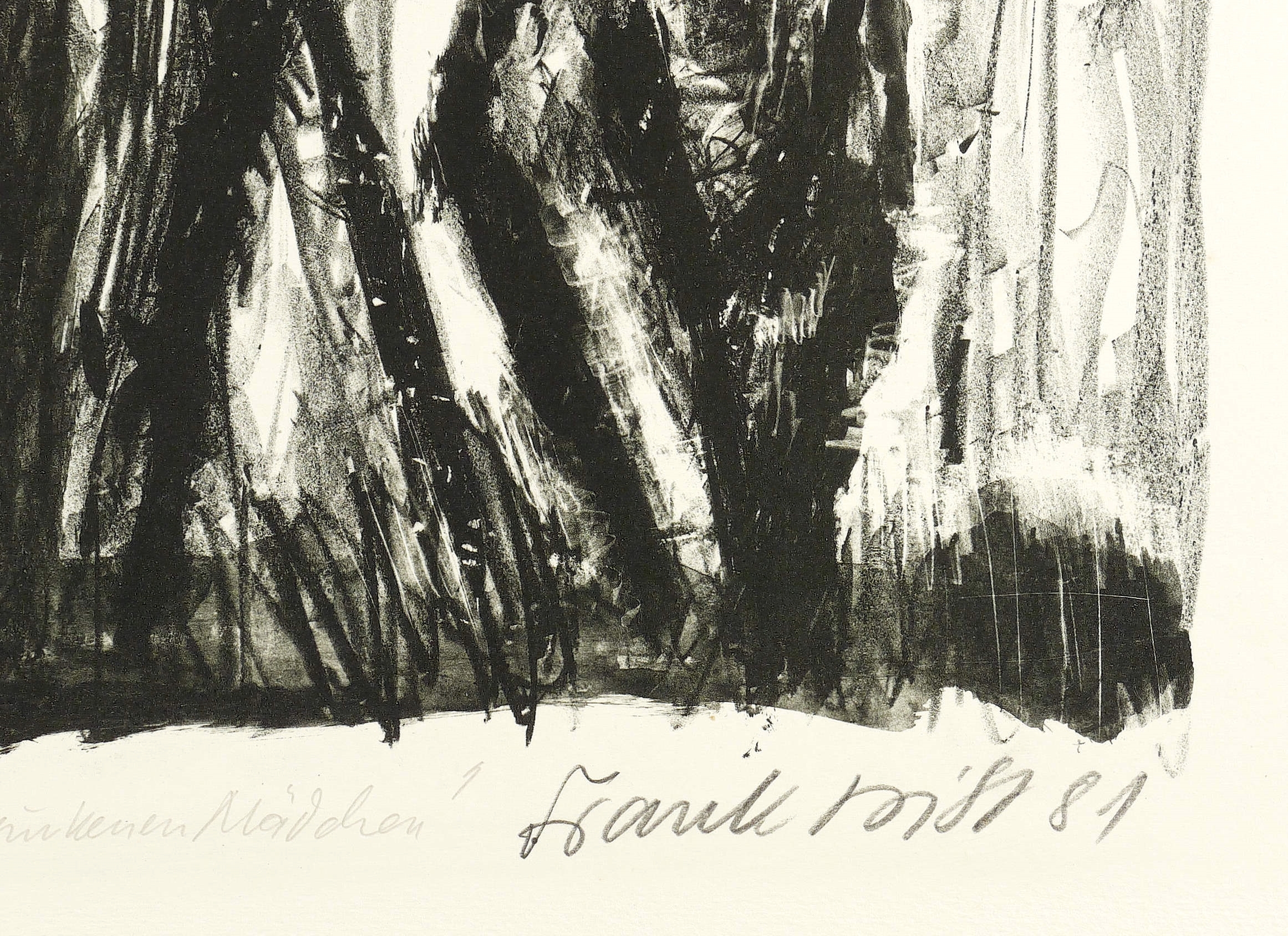 1981. Lithografie / Kreidelithografie, partiell geschabt, in Schwarz, auf Weißenborn-Bütten. – Originale Künstlergrafik, von Frank Voigt. – Auflage Exemplar Nr. 2/50. – 49,5 x 38,2 cm (Darstellung), 65 x 50 cm (Blatt).