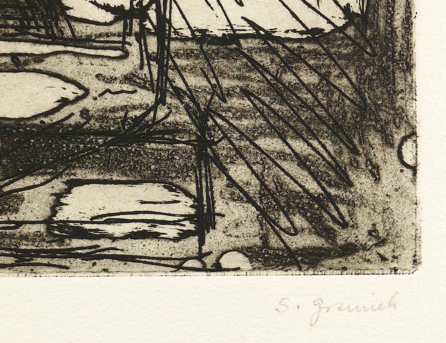 Um 1985. Radierung / Aquatinta & Strichätzung, in Schwarz, auf Hahnemühle-Bütten. – Originale Künstlergrafik, von Sabina Grzimek. – 32,3 x 24,6 cm (Darstellung / Platte), 53,5 x 39,5 cm (Blatt).