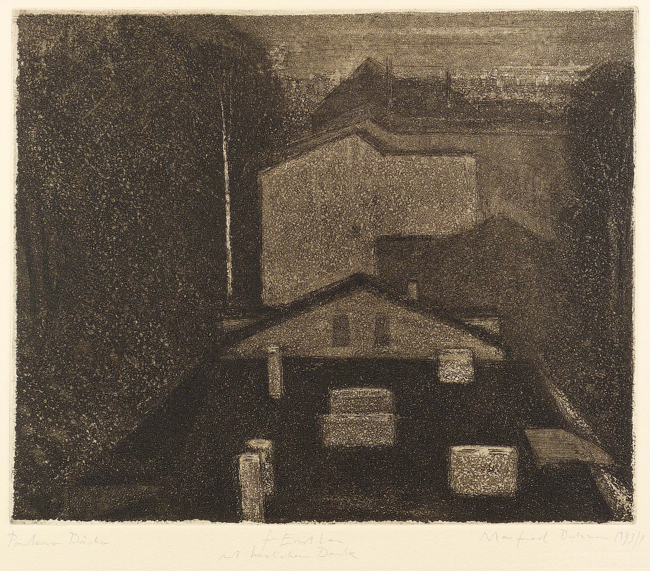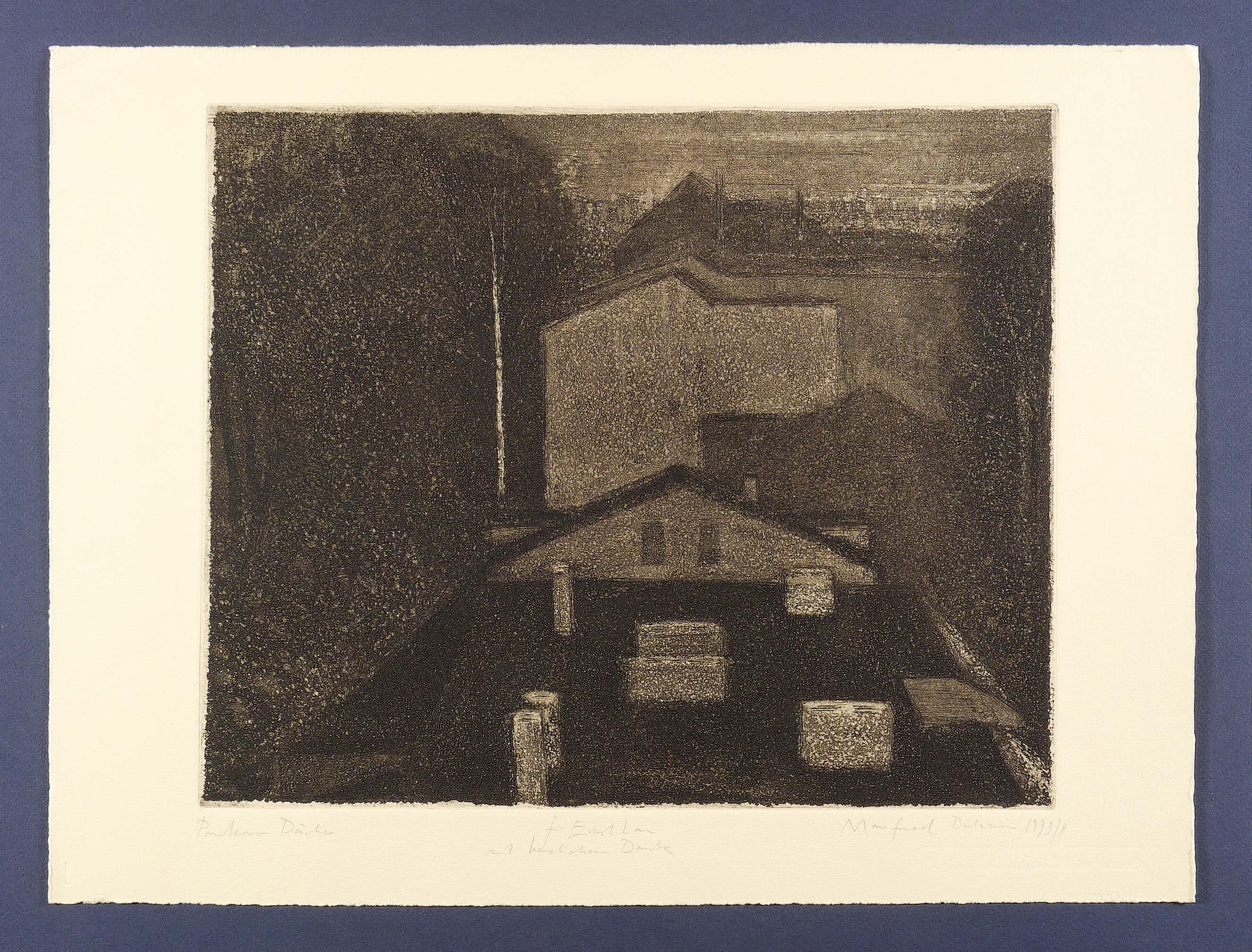 Manfred Butzmann (*1942 Potsdam, lebt und arbeitet in Potsdam-Bornim). Deutscher Grafiker. 1961-64 Ausbildung zum Offsetretuscheur in Berlin und Potsdam. Nebenher Malzirkel von Magnus Zeller in Caputh. 1964-69 Studium der Grafik an der Kunsthochschule Berlin-Weißensee bei Arno Mohr, Werner Klemke und Klaus Wittkugel. Ab 1970 freischaffender Grafiker, zunächst v.a. Buchillustration, später vermehrt Berliner Stadtlandschaften, denen er sich mit besonderem Erfolg widmete. 1973-77 Meisterschüler an der Akademie der Künste Berlin bei Werner Klemke. 1988-93 Gastdozent an der Kunsthochschule Berlin-Weißensee. 1991 Käthe-Kollwitz-Preis der Akademie der Künste Berlin.
