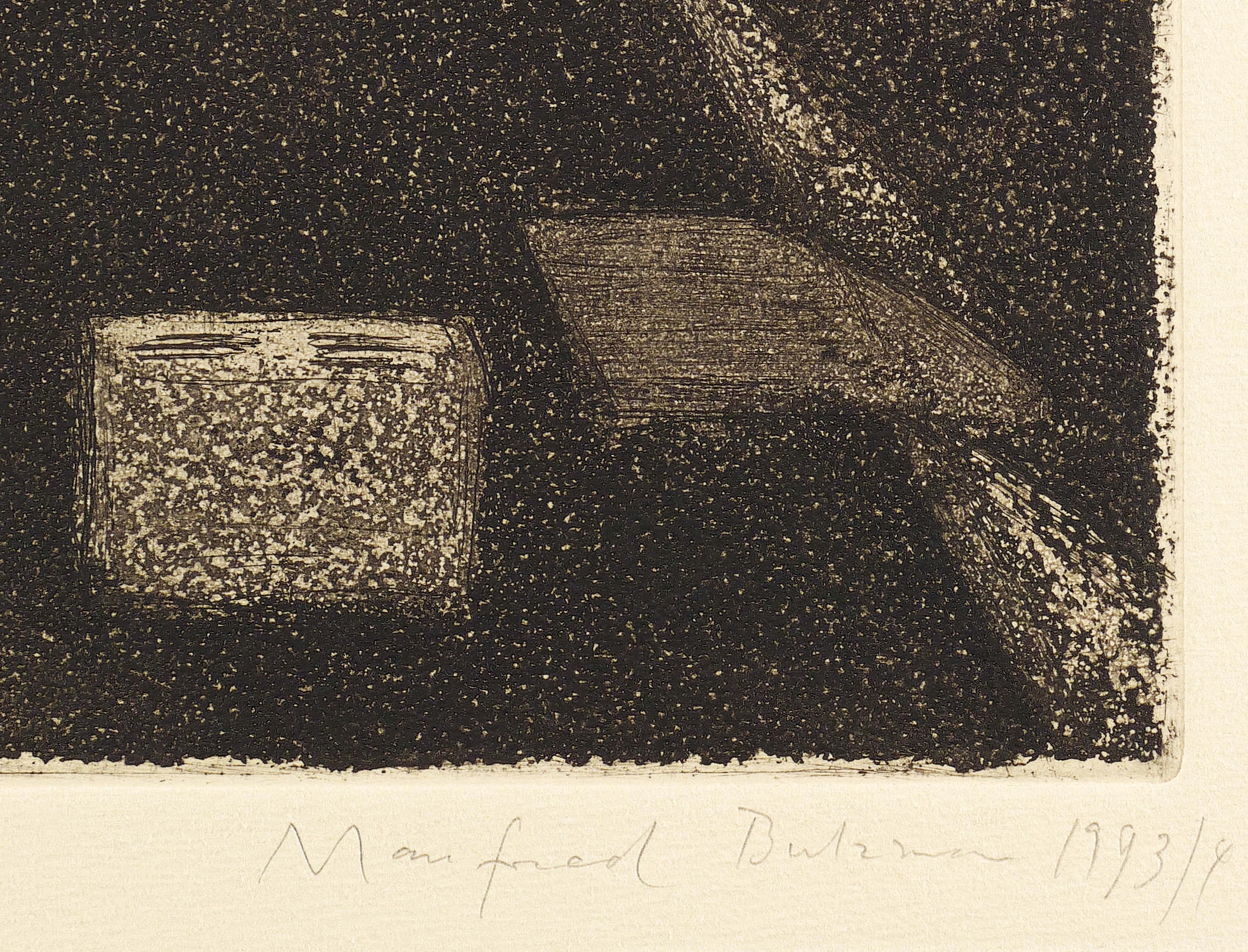 1993/1994. Radierung / Aquatinta, in Schwarzbraun, auf hellgelbem Büttenkarton. – Originale Künstlergrafik, von Manfred Butzmann. – Druckerexemplar. – 32,7 x 39,7 cm (Darstellung / Platte), 40 x 53 cm (Blatt).