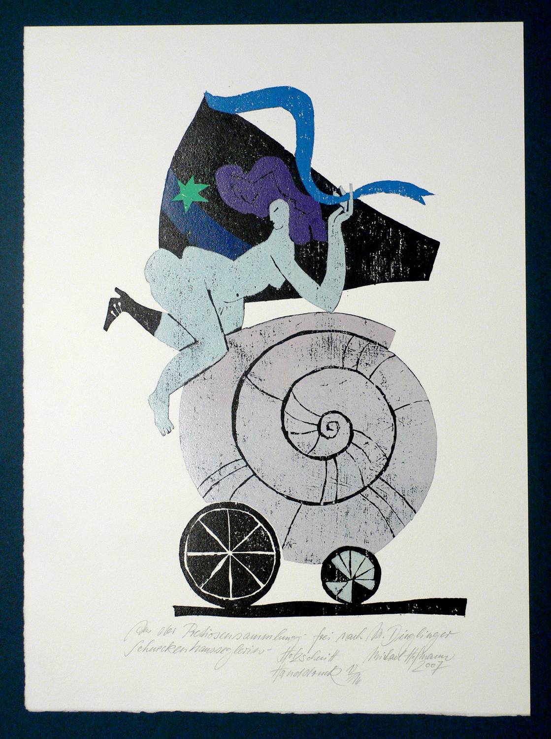 2007. Farbholzschnitt, auf Hahnemühle-Bütten. – Originale Künstlergrafik, von Michael Hofmann. – Auflage Exemplar Nr. 12/16. – 41,8 x 26,5 cm (Darstellung / Druckstock), 54, x 39,5 cm (Blatt).