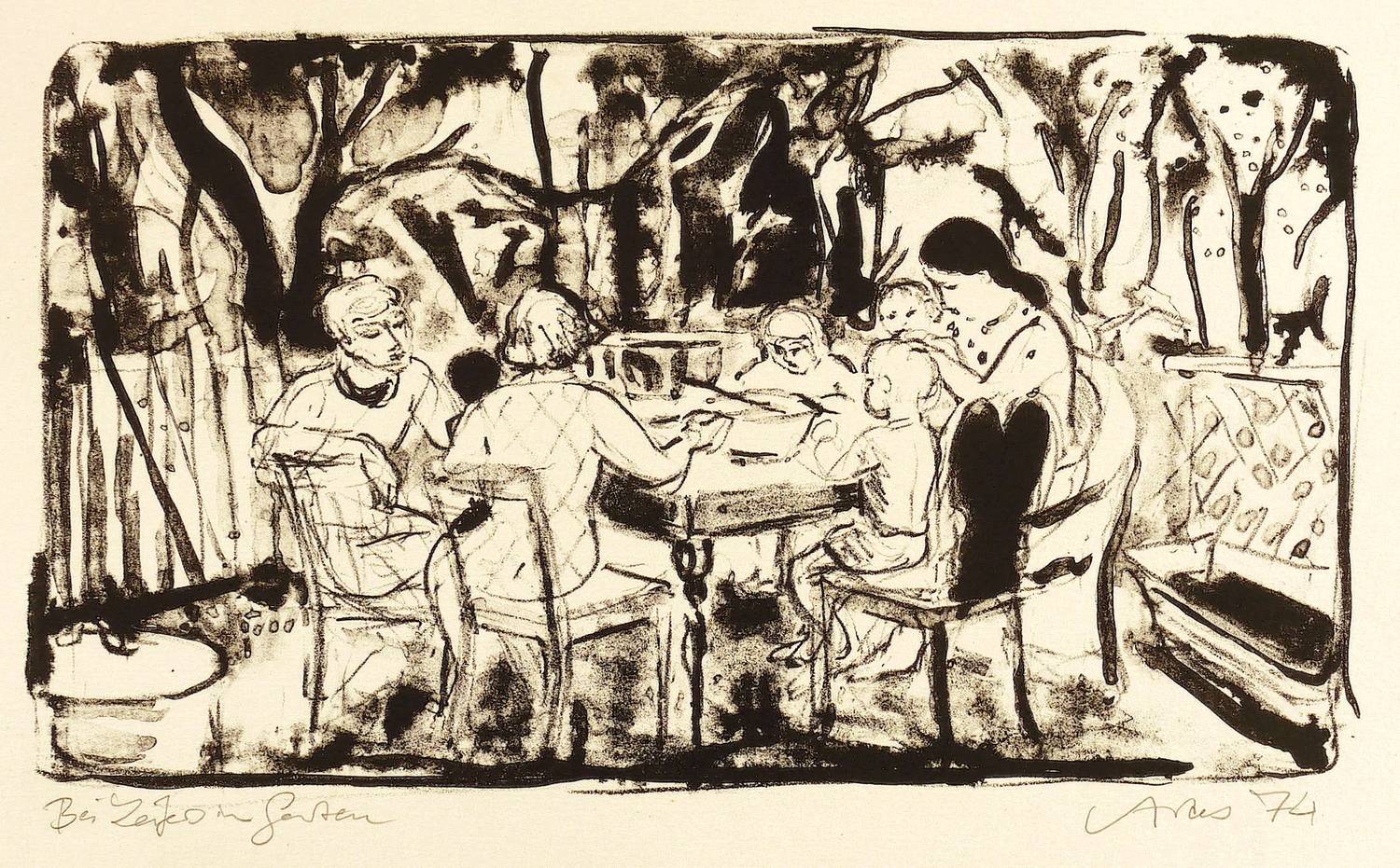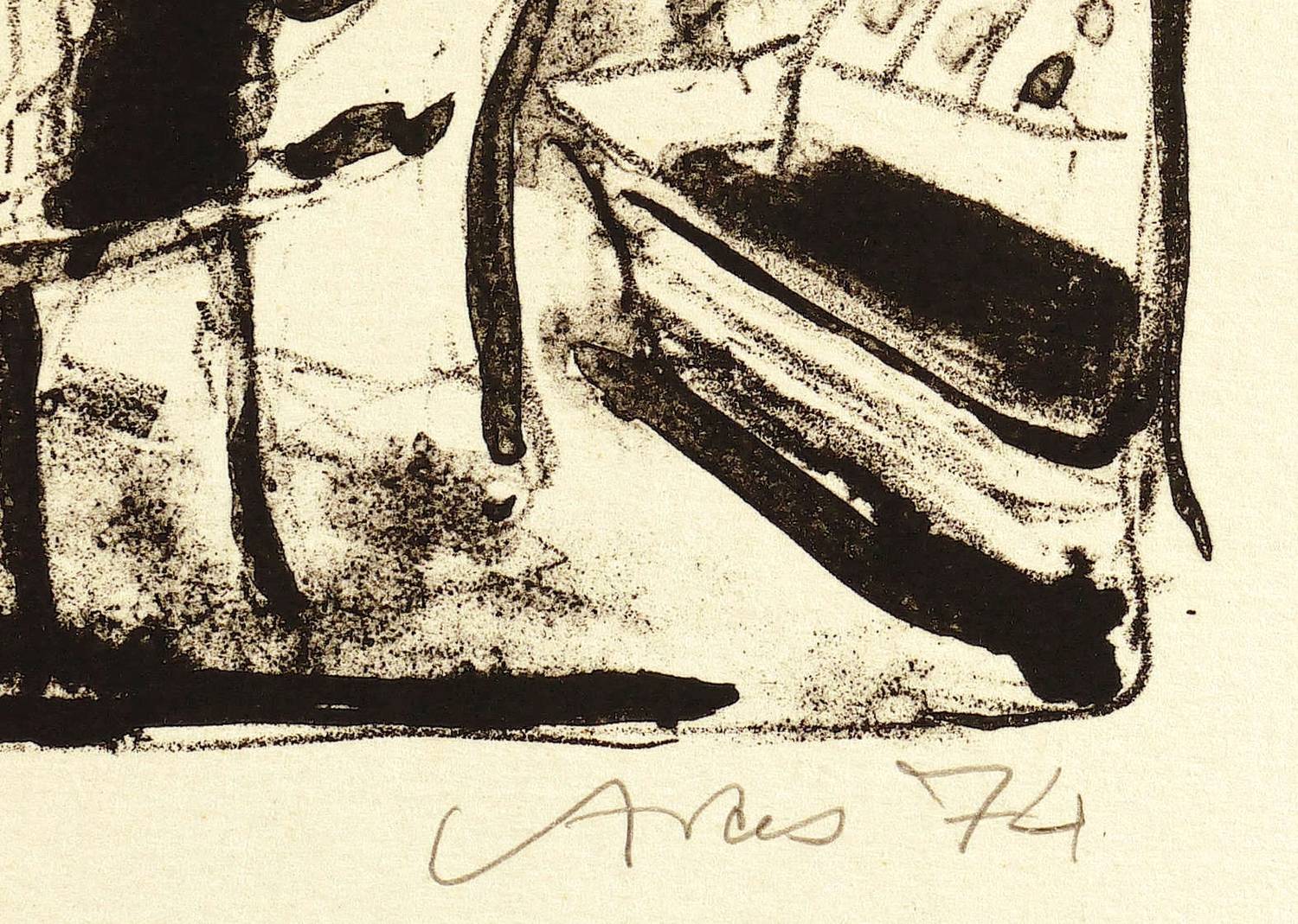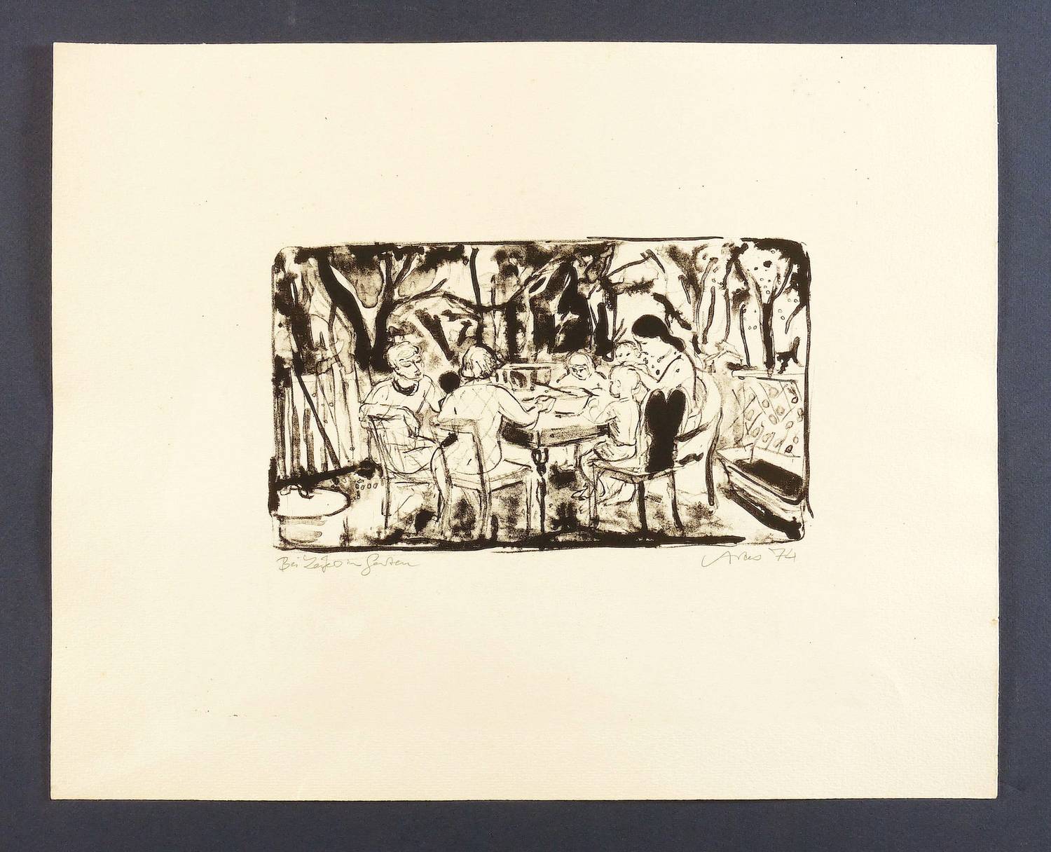1974. Lithografie / Pinsellithografie, in Schwarz, auf hellgelbem gehämmertem Maschinenbütten. – Originale Künstlergrafik, von Sigrid Artes. – 14,5 x 25,0 cm (Darstellung), 35 x 44 cm (Blatt).