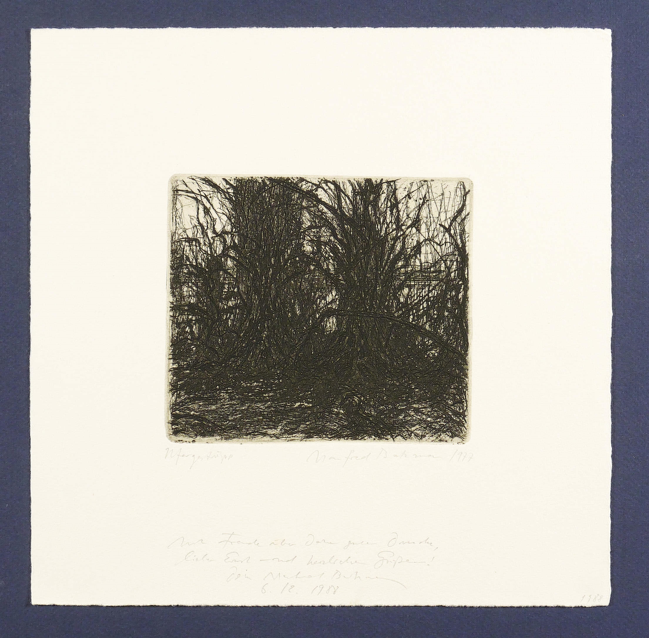 Rechts unten in Bleistift signiert und datiert. Links Titel. Am unteren Blattrand persönliche Widmung an den Drucker. – Sehr schön erhaltenes Exemplar.