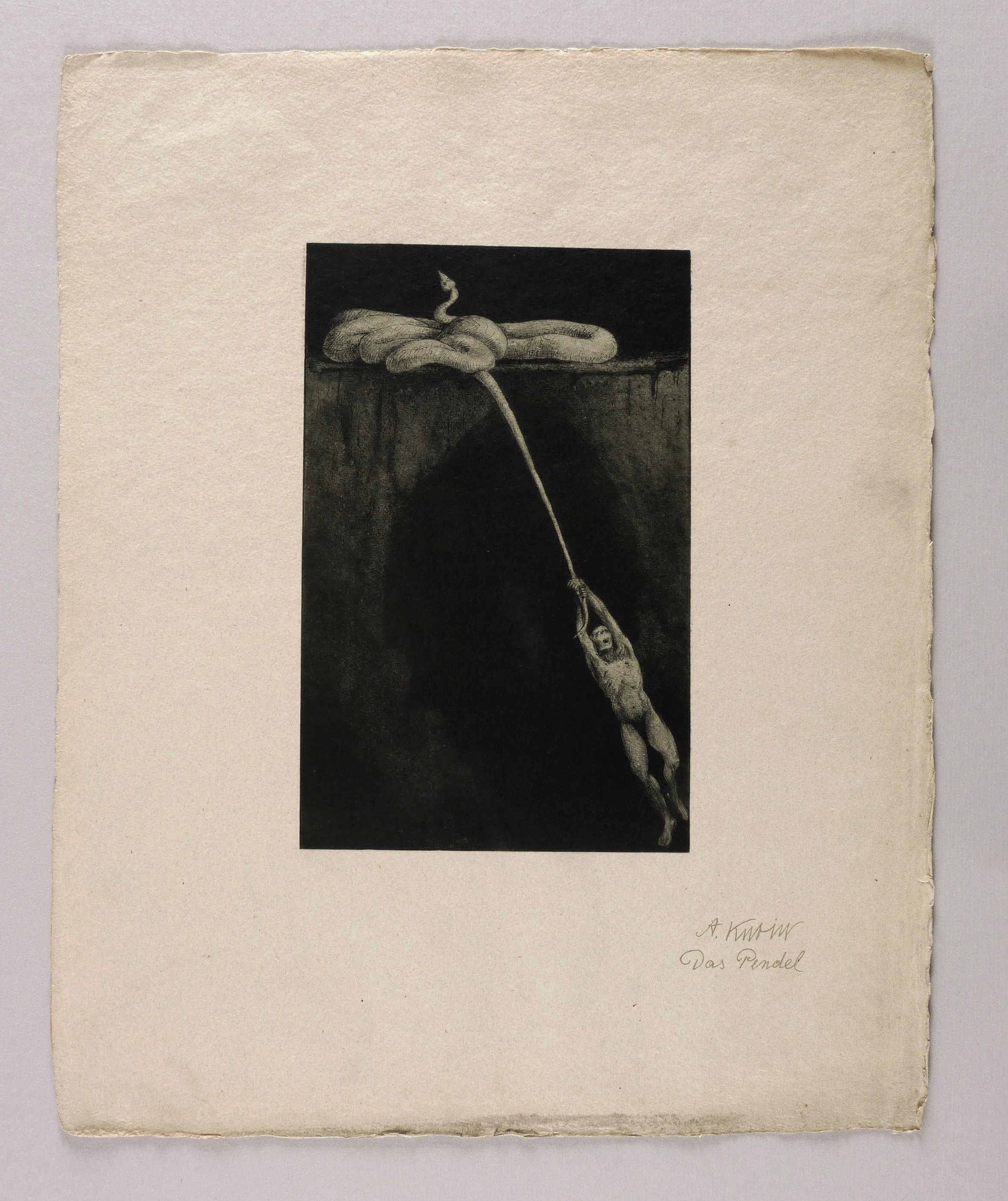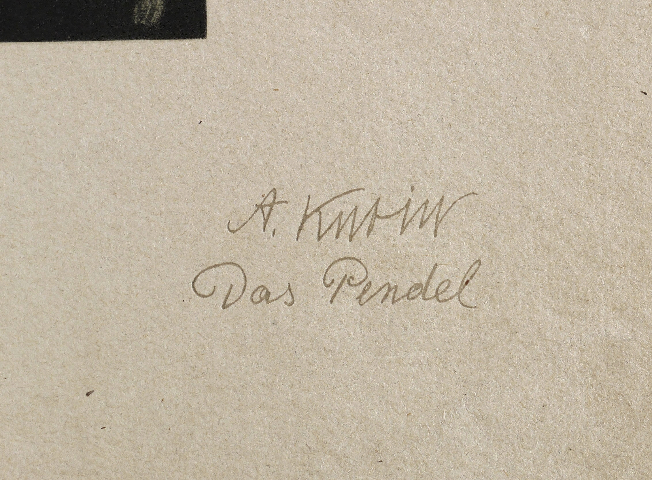 Raabe 8-4. – Aus: Alfred Kubin, Facsimiledrucke nach Kunstblättern (München: Hans von Weber Verlag 1903). – Nicht handsigniert. Rechts unten typografisch signiert und betitelt: ″A. Kubin / Das Pendel″. – Blatt Nr. 4 der aufwändig hergestellten sog. Weber-Mappe mit 17 Faksimiles nach getönten Federzeichnungen. Sie wurden von der Kunstanstalt J.B. Obernetter in München gedruckt. - Die typografischen Bezeichnungen der Blätter im Cliché-Verfahren unter die Darstellungen gesetzt. – Geringe Altersspuren. Durchgehend etwas knickspurig und minimal angestaubt. Untere Blattkante mit älteren hellgrauen Tuschspuren. Keine Montagespuren. Guter Zustand.
