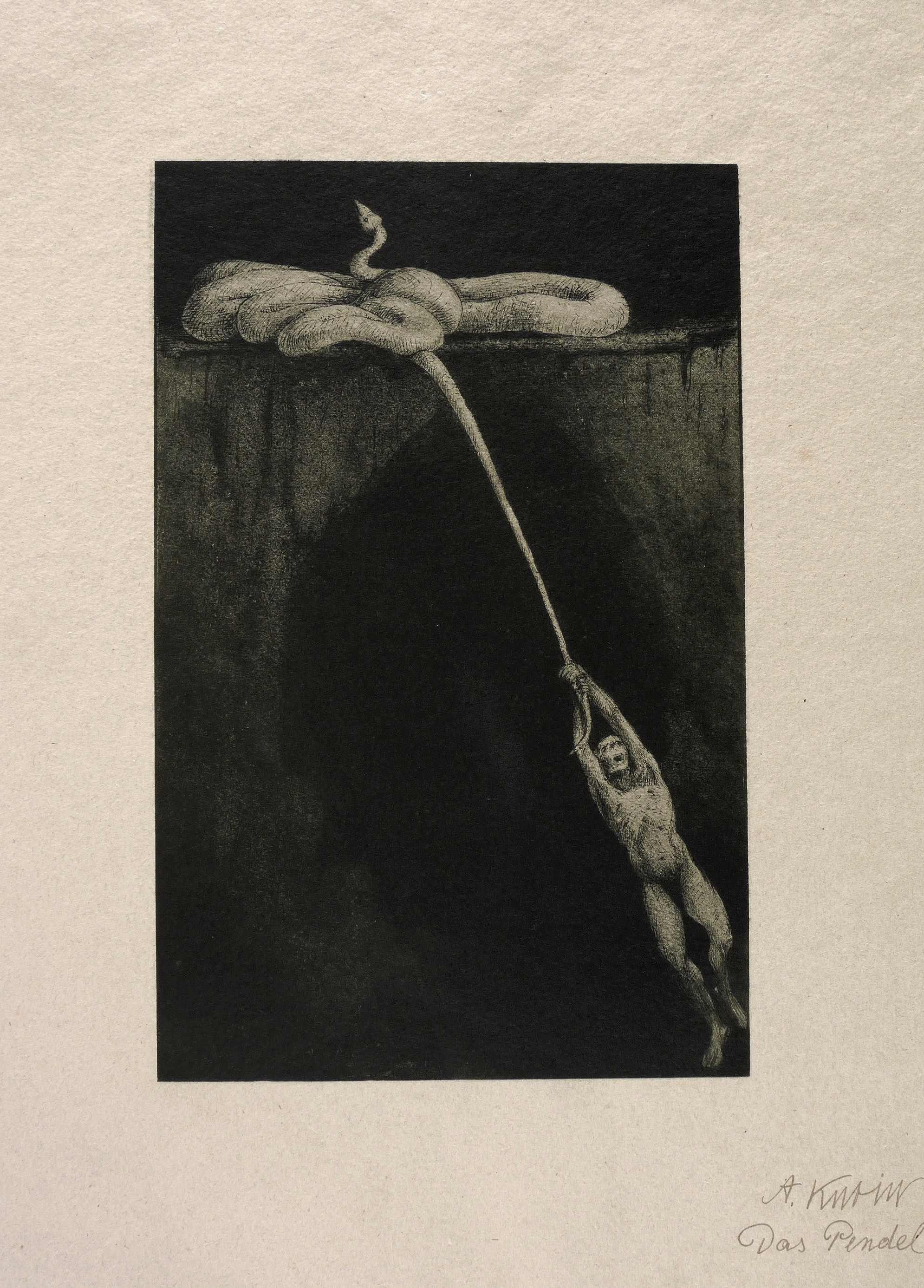 Alfred Kubin (1877 Leitmeritz - 1959 Zwickledt). Eigentlich Alfred Leopold Isidor Kubin. Österreichischer Grafiker und Illustrator. Ausbildung zum Fotografen bei einem Onkel in Klagenfurt. Frühe Beeinflussung durch den metaphysischen Pessimismus Artur Schopenhauers. 1898/99 der Besuch an der Königlichen Akademie in München bei Nikolaus Gysis, daneben andere private Zeichenschulen (z.B. bei Ludwig Schmidt-Reutte). 1899 inspiriert ihn Max Klingers Radierzyklus 'Paraphrase über den Fund eines Handschuhs' zu seiner ersten großen Schaffensphase bis 1903. Bekanntschaft mit Bruno Cassirer. 1909 Entstehung des phantastischen Romans 'Die andere Seite' mit eigenen Illustrationen. 1911 Mitglied der Künstlergruppe "Blauer Reiter". Er illustriert in seinem Leben ca. 60 Bücher, u.a. Dostojewski und Poe. Der frühe Tod der Mutter und die Spannungen mit dem Vater führten zu seelischen Krisen und andauernder Melancholie. Das Geheimnisvoll-Imaginative, das Unheimliche und Alptraumhafte sind typisch für sein Werk und erinnern an Goya und Redon.
