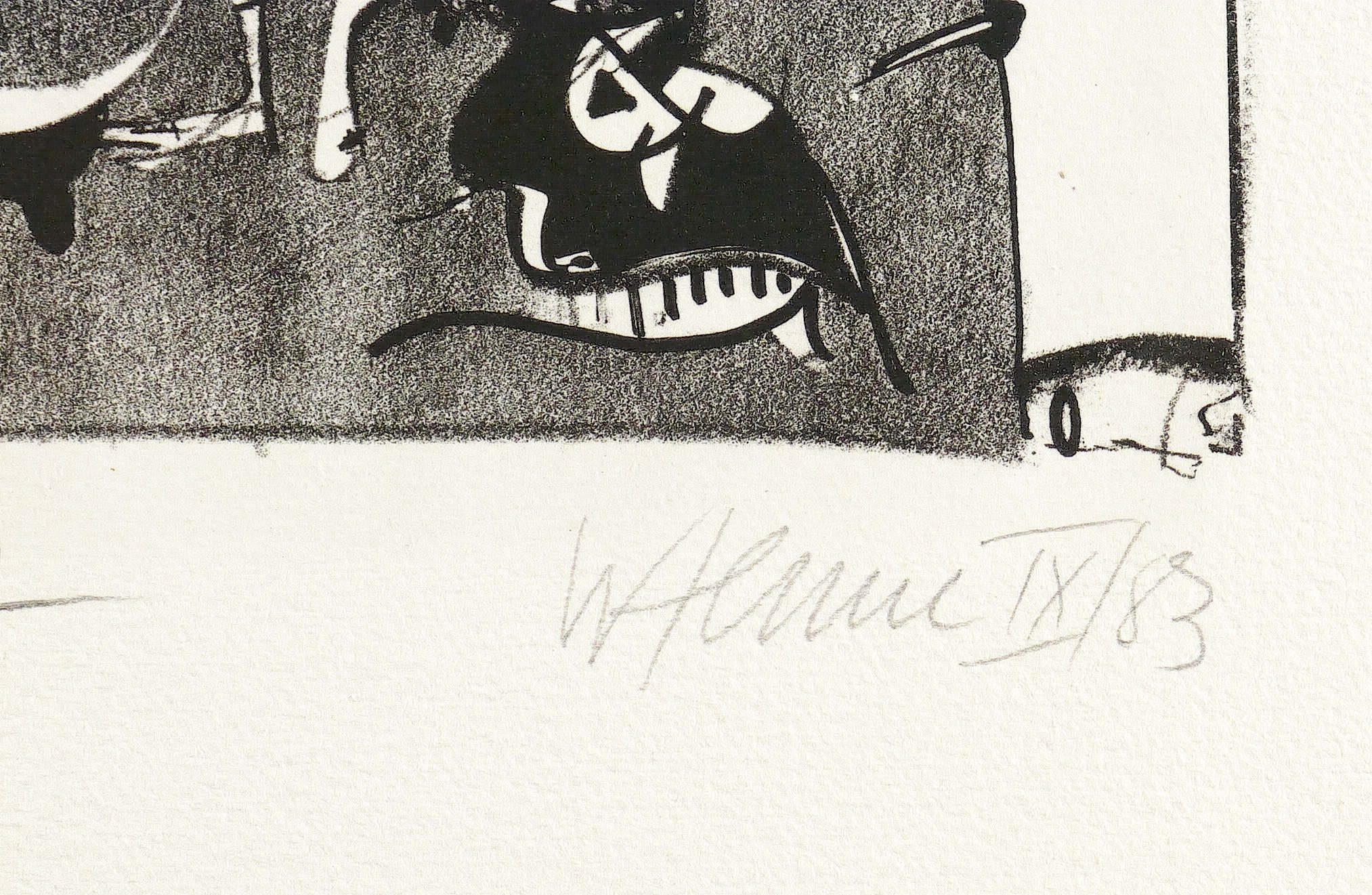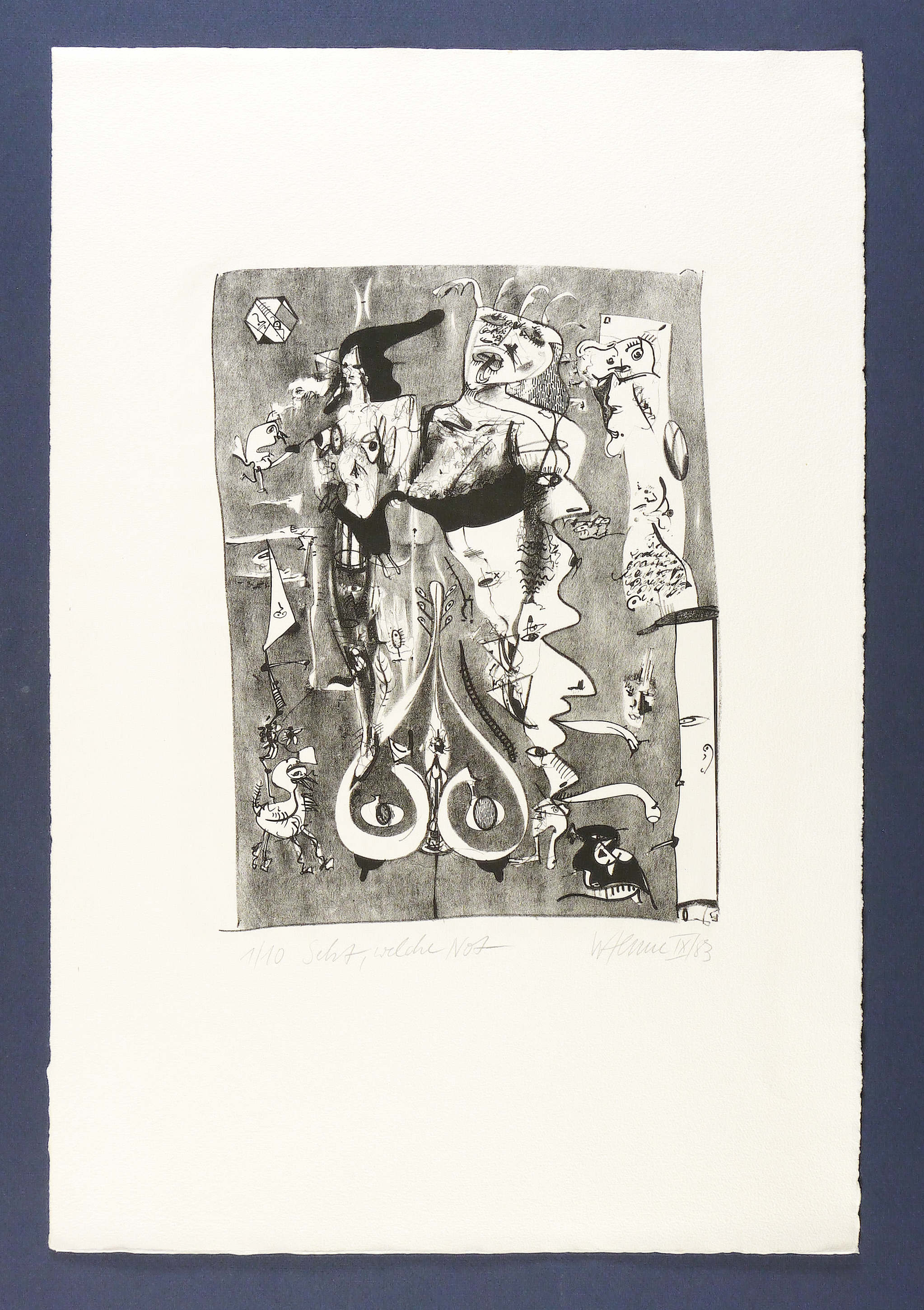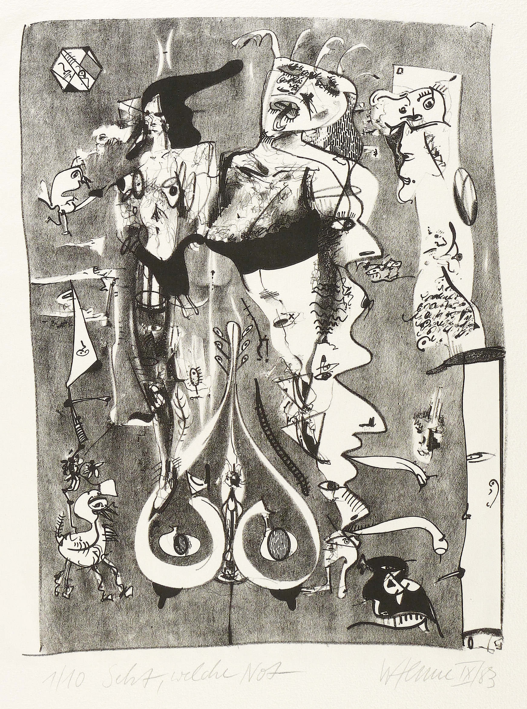 1983. Lithografie / Kreide- & Pinsellithografie, in Schwarz, auf hellem Aquarellkarton. – Originale Künstlergrafik, von Wolfgang Henne. – Auflage Exemplar Nr. 1/10. – 30,2 x 22,6 cm (Darstellung / Druckbild), 56 x 37 cm (Blatt).