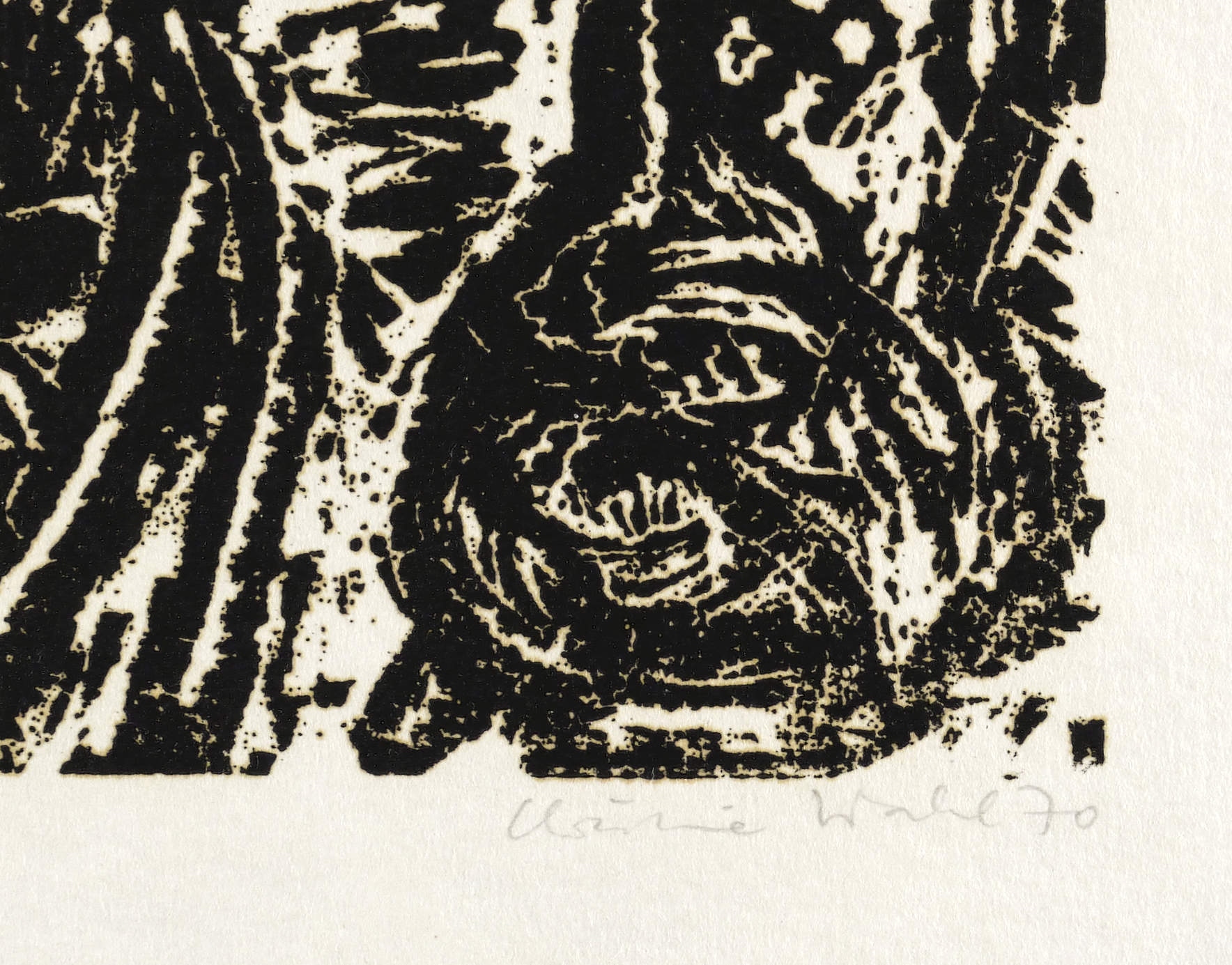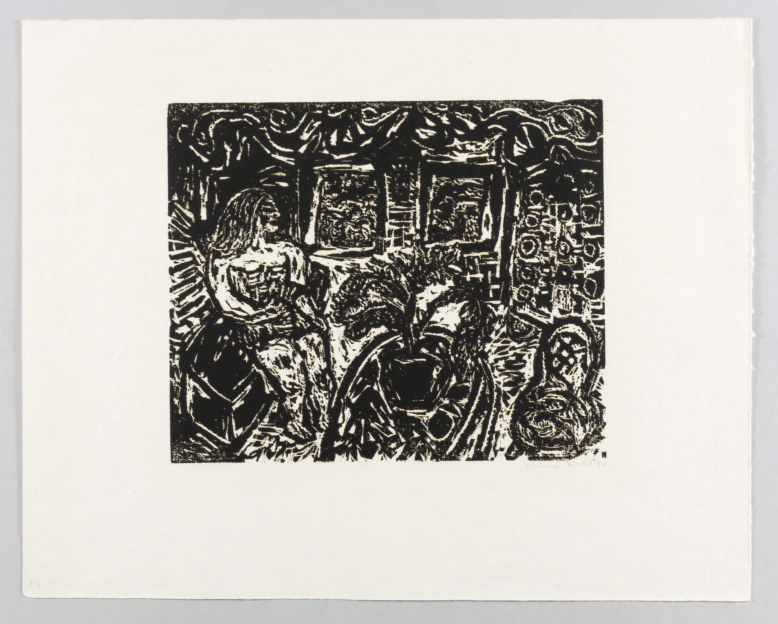 1970. Holzschnitt, in Schwarz, auf wolkigem rauem Velinkarton. – Originale Künstlergrafik, von Christine Wahl. – Auflage Exemplar Nr. 37/100. – 24,7 x 29,9 cm (Darstellung), 40 x 50 cm (Blatt).