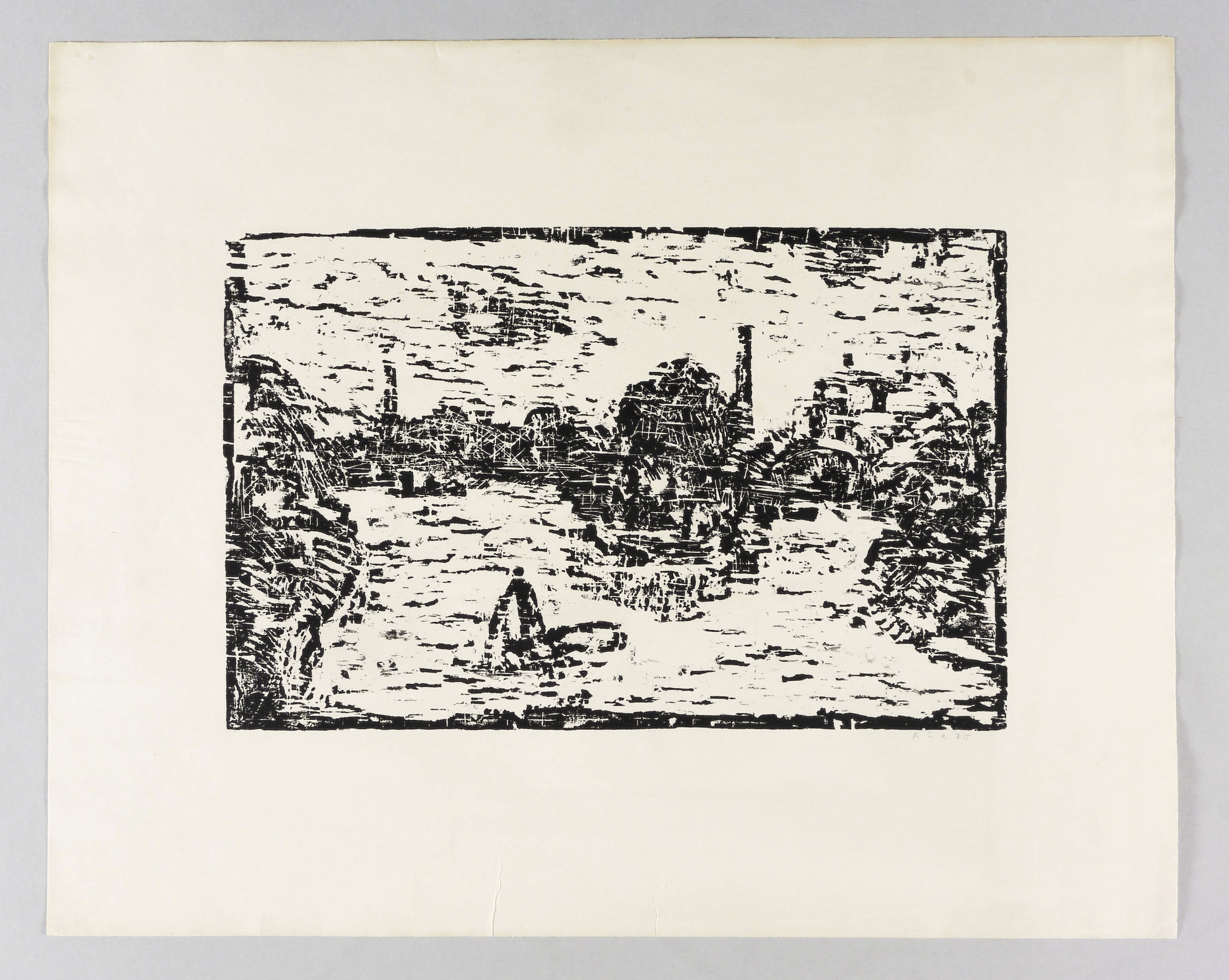 1970. Holzschnitt, in Schwarz, auf hellgelbem Velinkarton. – Von Jochen Aue. – 22,5 x 35,0 cm (Darstellung / Druckstock), 40 x 50 cm (Blatt).