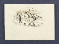 1965-1975. Zeichnung / Federzeichnung, in schwarzer Tusche, in Grau laviert, auf gelbem Velin. – Originale Künstlergrafik, von Gertrud Grießbach. – Unikat. – 4,3 x 7,2 cm (Darstellung), 7,6 x 10,5 cm (Blatt).