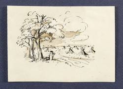 1965-1975. Zeichnung / Federzeichnung, in schwarzer Tusche, in Grau laviert, auf gelbem Velin. – Originale Künstlergrafik, von Gertrud Grießbach. – Unikat. – 5,5 x 7,8 cm (Darstellung), 7,5 x 10,5 cm (Blatt).