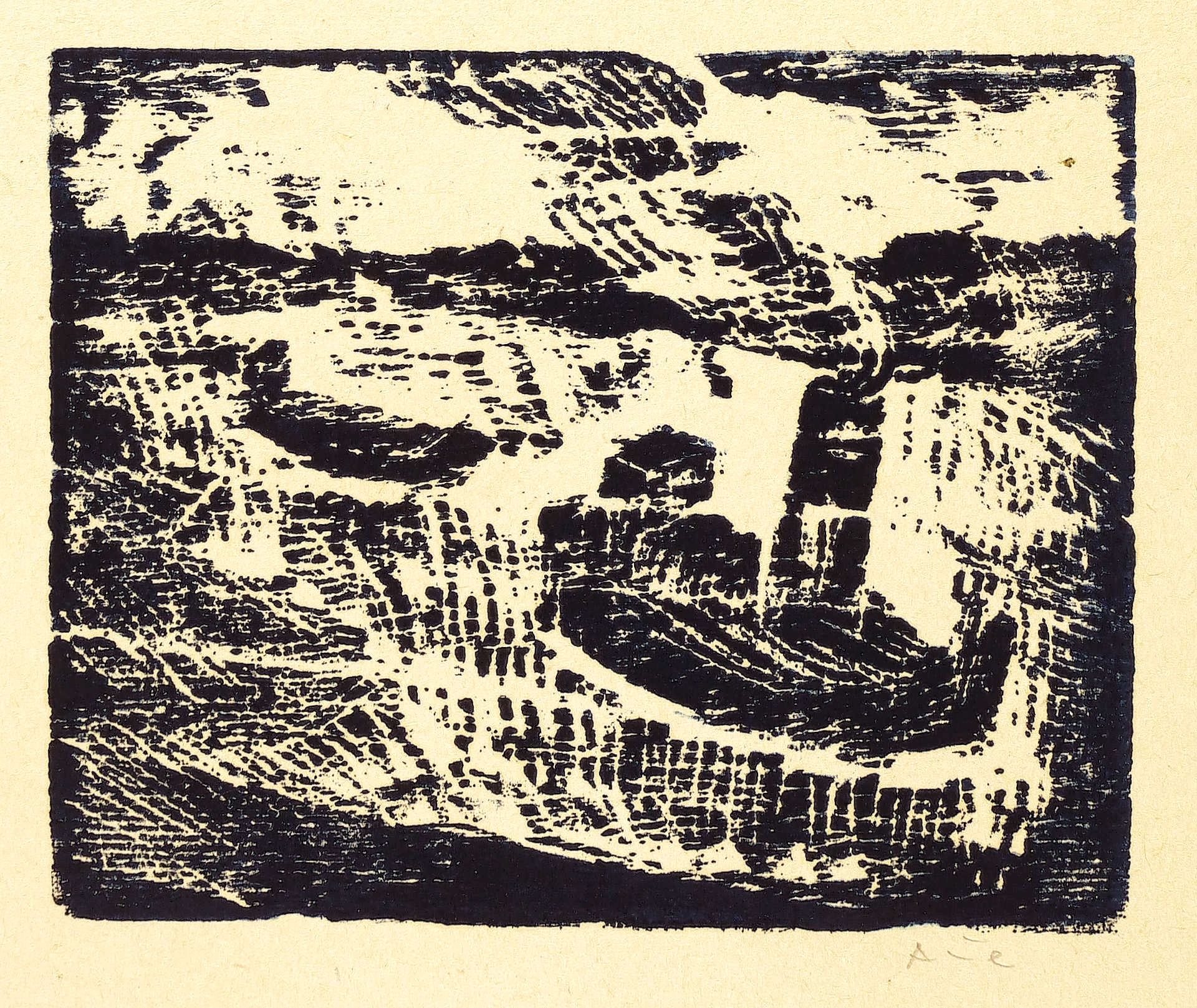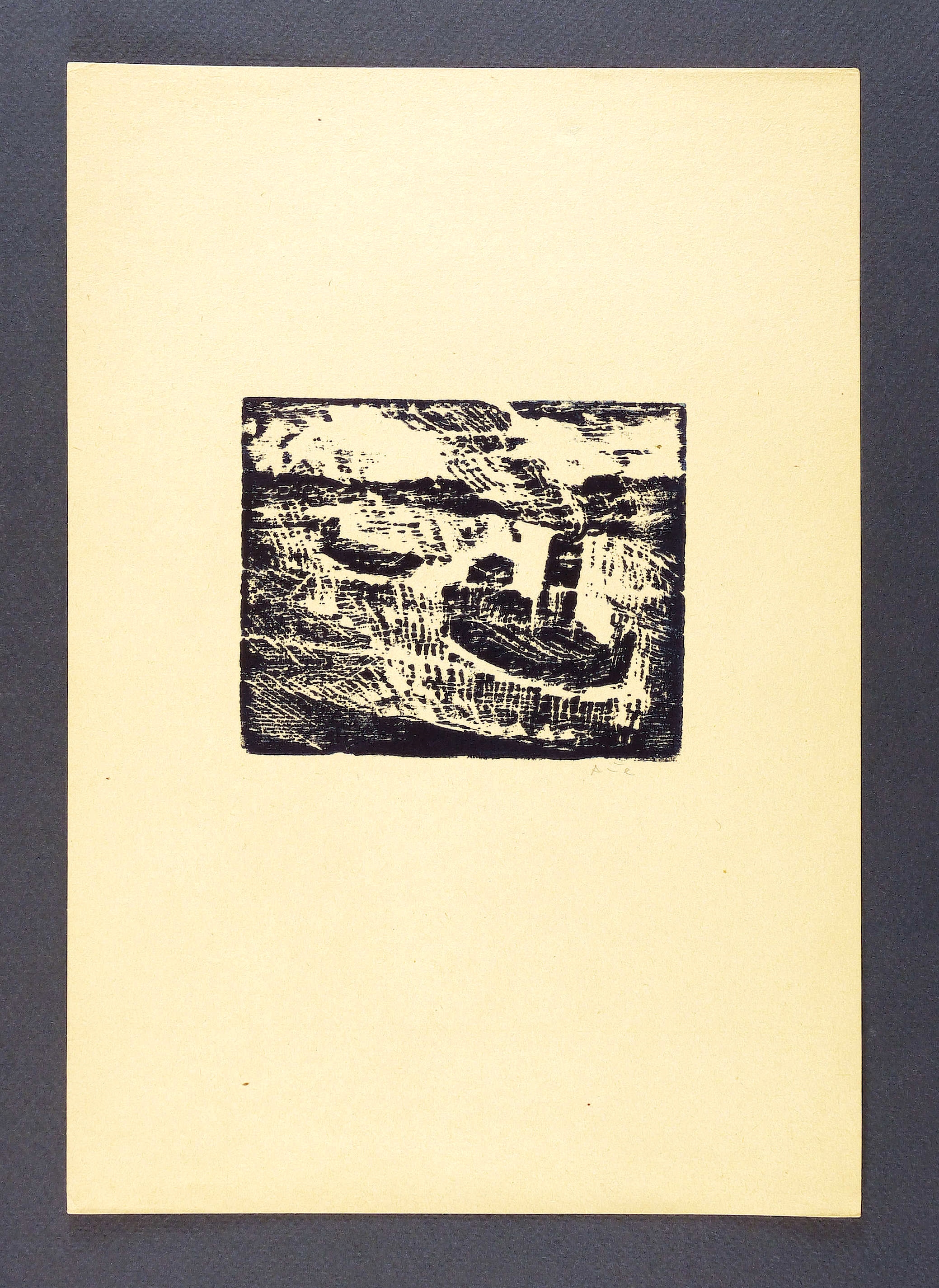 Um 1970. Holzschnitt, in Schwarz, auf rauem gelborangem Papier. – Originale Künstlergrafik, von Jochen Aue. – 9,3 x 11,5 cm (Darstellung / Druckstock), 30 x 21 cm (Blatt).