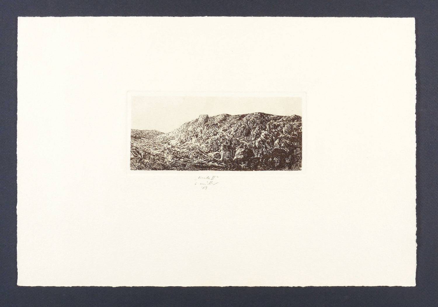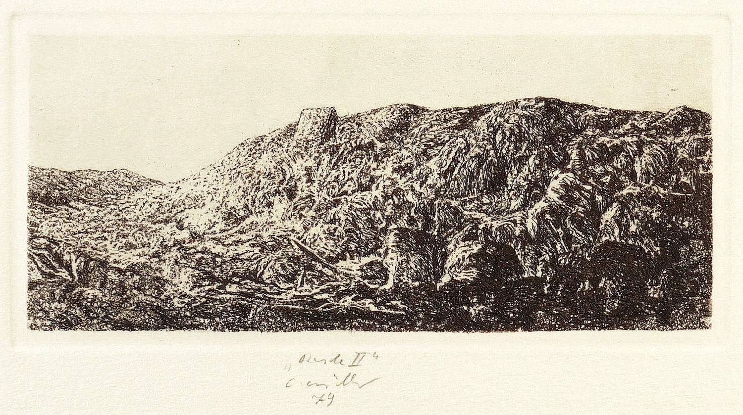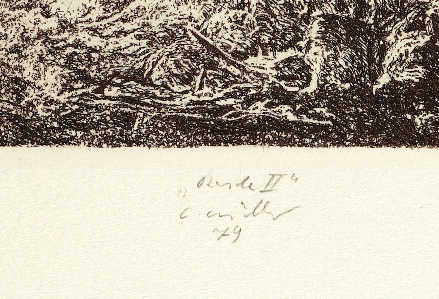 1979. Radierung / Strichätzung, mit Plattenton, in Schwarzbraun, auf Büttenpapier. – Originale Künstlergrafik, von Claus Müller-Schloen. – 7,3 x 17,0 cm (Darstellung), 8,4 x 17,8 cm (Platte), 26,5 x 39,5 cm (Blatt).