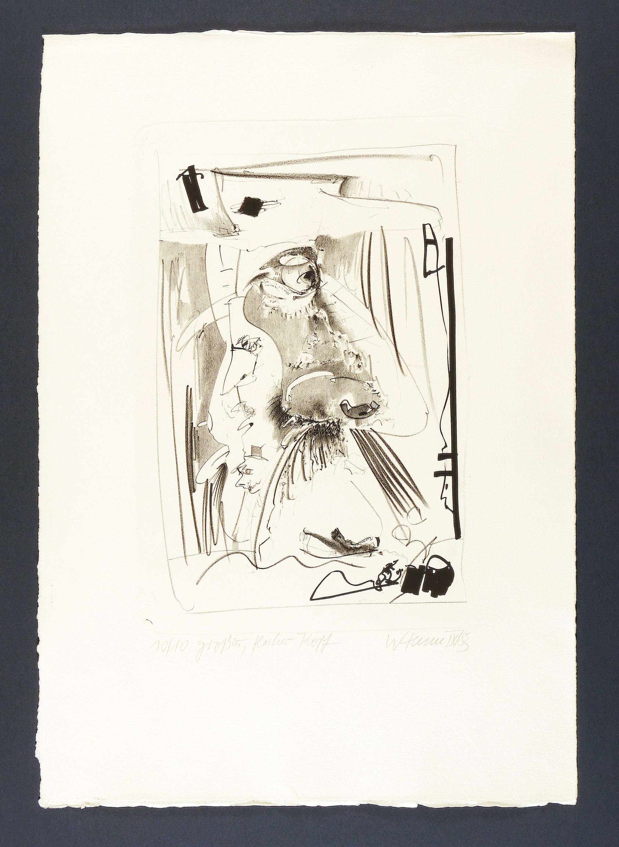 1983. Lithografie / Kreide- & Pinsellithografie, in Schwarz, auf Hahnemühle-Bütten. – Von Wolfgang Henne. – Auflage Exemplar Nr. 10/10. – 34,0 x 23,0 cm (Darstellung / Druckbild), 56,5 x 39 cm (Blatt).