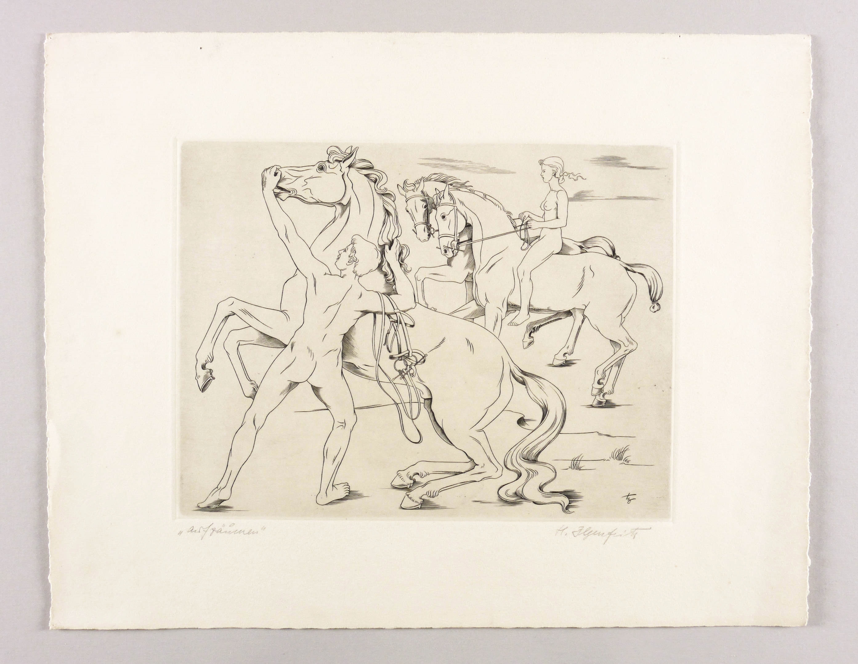 1930-1940. Kupferstich / Linienstich, mit Plattenton, in Schwarz, auf weichem gelbem Velin. – Originale Künstlergrafik, von Heinrich Ilgenfritz. – 22,6 x 29,7 cm (Darstellung / Platte), 36 x 46 cm (Blatt).