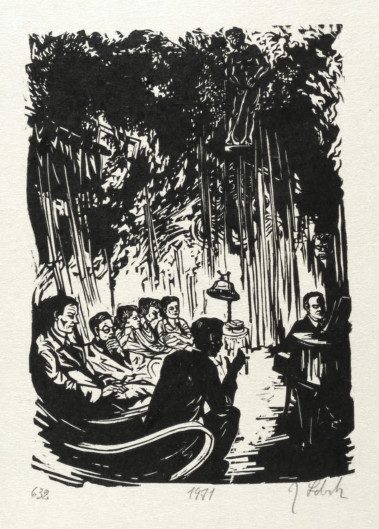 Johannes Lebek (1901 Zeitz - 1985 Adelebsen). Deutscher Holzschneider, Grafiker und Illustrator. Sohn eines Grubenarbeiters. Nach dem Tod des Vaters 1911-15 Waisenhaus in Torgau. 1915-17 Lehre zum Tischler in Birnbaum an der Warthe (heute Międzychód). 1920-22 erster Zeichenunterricht bei Anton Klamroth in Leipzig. 1926 Mitglied des Ostthüringer Künstlerbundes. 1931-34 Studium er an der Akademie für graphische Künste und Buchgewerbe Leipzig, Meisterschüler bei Hans Alexander Müller. 1934-39 entstanden die Holzschnitt-Zyklen "Pommersche Landschaften" und "Knapsackbilder". 1937 Silbermedaille der Weltausstellung in Paris für das Blockbuch "Elisabethchen". 1939-44 Technischer Zeichner bei den Junkers Flugzeug- und Motorenwerken in Dessau. 1945/46 Einberufung in die Wehrmacht und amerikanische Kriegsgefangenschaft in Frankreich. Ab 1946 als freischaffender Künstler in Zeitz. 1954-58 Dozent für Naturstudium und Leiter Holzschnittwerkstatt an der Hochschule für Grafik und Buchkunst Leipzig (HGB). 1953 Gründungsmitglied der Internationalen Holzschneidervereinigung XYLON. 1958 Entlassung aus der HGB Leipzig aus politischen Gründen, nur noch eingeschränkte Möglichkeiten der Ausstellung und Veröffentlichung seiner Werke (z.B. in christlichen Verlagen). 1969 Ausreise aus der DDR und Ansiedlung in Adelebsen bei Göttingen. 1971-82 Edition der Holzschnitt-Serie "Lebenserinnerungen" als Beilage in der Kunstzeitschrift "Illustration 63". 2001 Kunst- und Museumspädagogisches Zentrum Johannes Lebek in Zeitz.