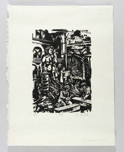 Johannes Lebek (1901 Zeitz - 1985 Adelebsen). Deutscher Holzschneider, Grafiker und Illustrator. Sohn eines Grubenarbeiters. Nach dem Tod des Vaters 1911-15 Waisenhaus in Torgau. 1915-17 Lehre zum Tischler in Birnbaum an der Warthe (heute Międzychód). 1920-22 erster Zeichenunterricht bei Anton Klamroth in Leipzig. 1926 Mitglied des Ostthüringer Künstlerbundes. 1931-34 Studium er an der Akademie für graphische Künste und Buchgewerbe Leipzig, Meisterschüler bei Hans Alexander Müller. 1934-39 entstanden die Holzschnitt-Zyklen "Pommersche Landschaften" und "Knapsackbilder". 1937 Silbermedaille der Weltausstellung in Paris für das Blockbuch "Elisabethchen". 1939-44 Technischer Zeichner bei den Junkers Flugzeug- und Motorenwerken in Dessau. 1945/46 Einberufung in die Wehrmacht und amerikanische Kriegsgefangenschaft in Frankreich. Ab 1946 als freischaffender Künstler in Zeitz. 1954-58 Dozent für Naturstudium und Leiter Holzschnittwerkstatt an der Hochschule für Grafik und Buchkunst Leipzig (HGB). 1953 Gründungsmitglied der Internationalen Holzschneidervereinigung XYLON. 1958 Entlassung aus der HGB Leipzig aus politischen Gründen, nur noch eingeschränkte Möglichkeiten der Ausstellung und Veröffentlichung seiner Werke (z.B. in christlichen Verlagen). 1969 Ausreise aus der DDR und Ansiedlung in Adelebsen bei Göttingen. 1971-82 Edition der Holzschnitt-Serie "Lebenserinnerungen" als Beilage in der Kunstzeitschrift "Illustration 63". 2001 Kunst- und Museumspädagogisches Zentrum Johannes Lebek in Zeitz.