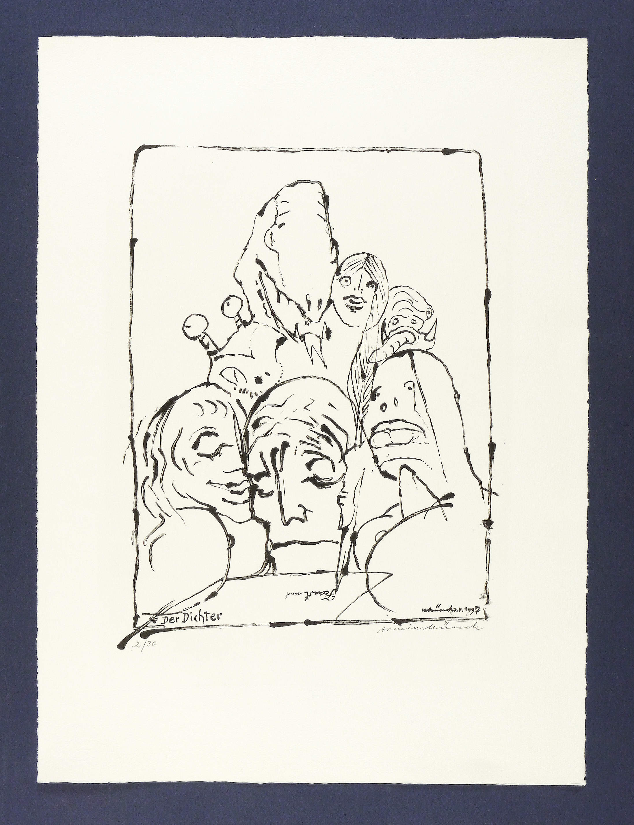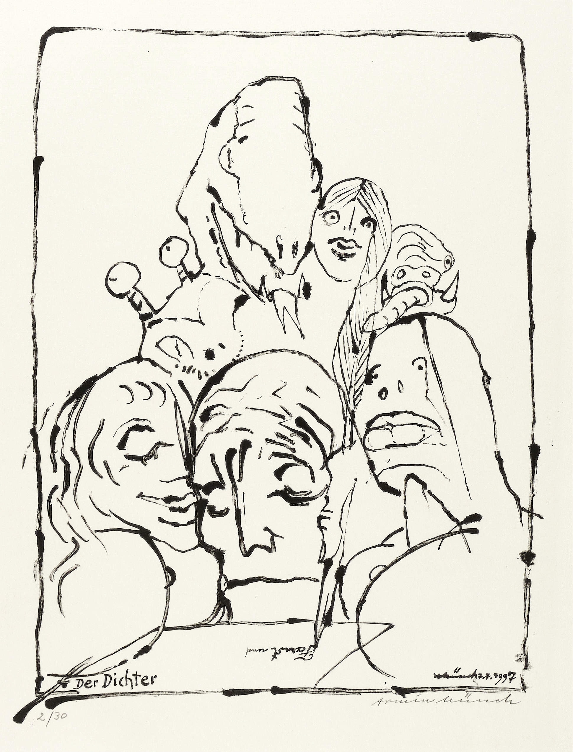 Aus: Armin Münch, Faustmephisto (Weimar: Galerie Profil 1999). – Rechts unten in Bleistift signiert. Links Auflagenbezeichnung. Im Stein unten zusätzlich Titel, Signatur und Datum. – Aus der Lithografie-Folge ″Faustmephisto″ von 1999 (Weimar: Galerie Profil). – Sehr guter Zustand.