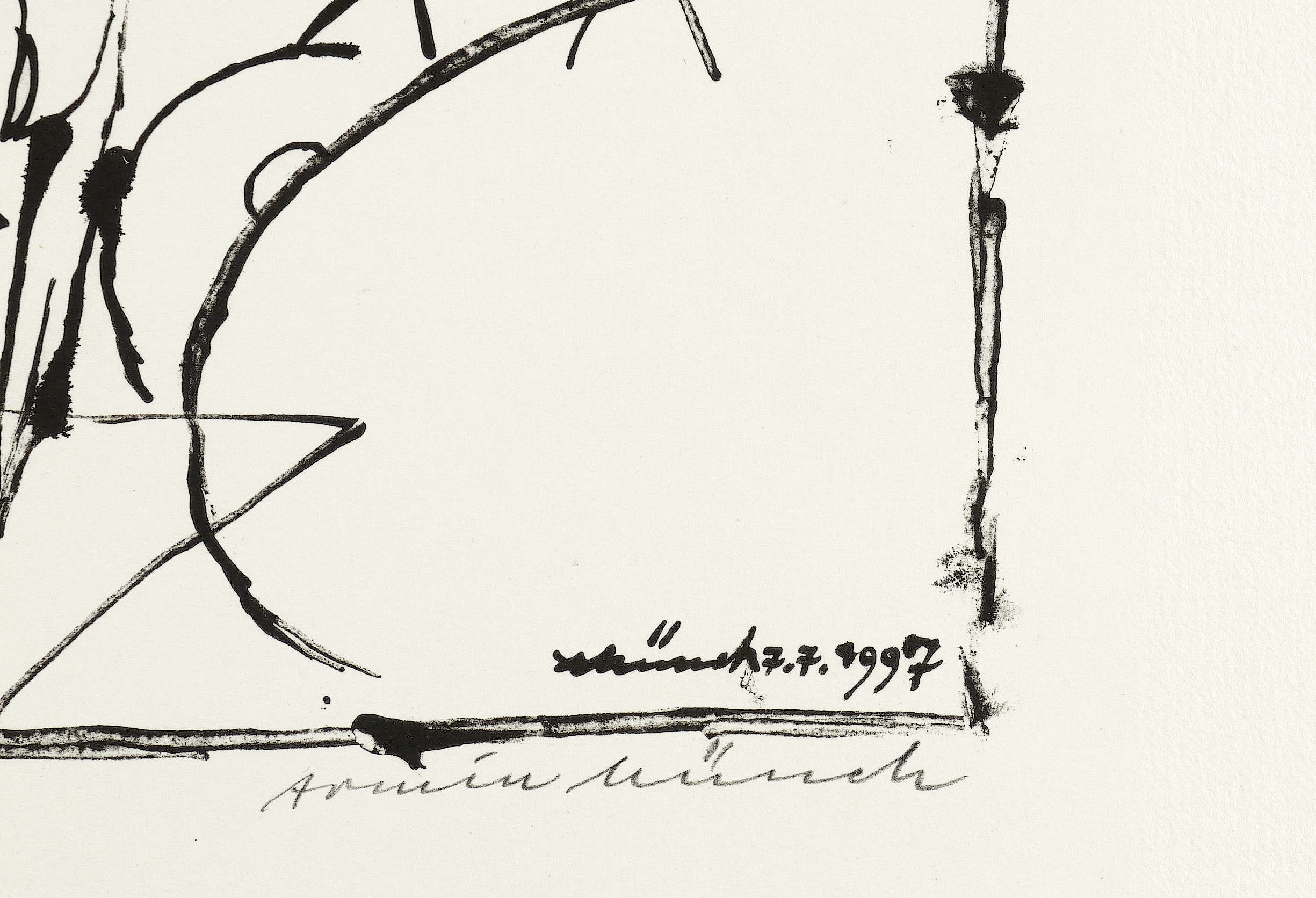 1997. Lithografie / Pinsellithografie, in Schwarz, auf hellchamois Hahnemühle. – Originale Künstlergrafik, von Armin Münch. – Auflage Exemplar Nr. 2/30. – 35,8 x 26,7 cm (Darstellung / Druckbild), 54 x 40 cm (Blatt).