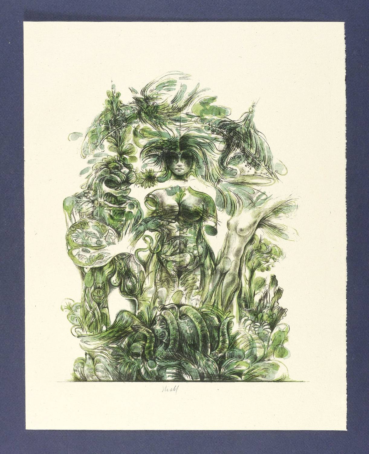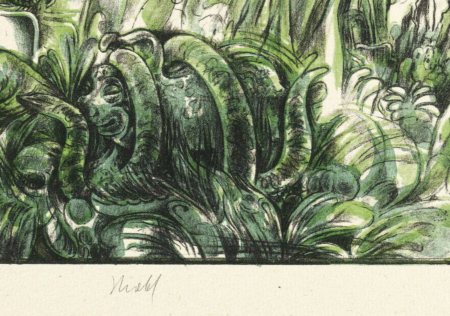 1980. Farblithografie / Kreidelithografie, in 2 Farben, auf rauem gelblichem Büttenpapier. – Originale Künstlergrafik, von Rainer Herold. – 28,3 x 22,7 cm (Darstellung / Druckbild), 37,5 x 29,5 cm (Blatt).