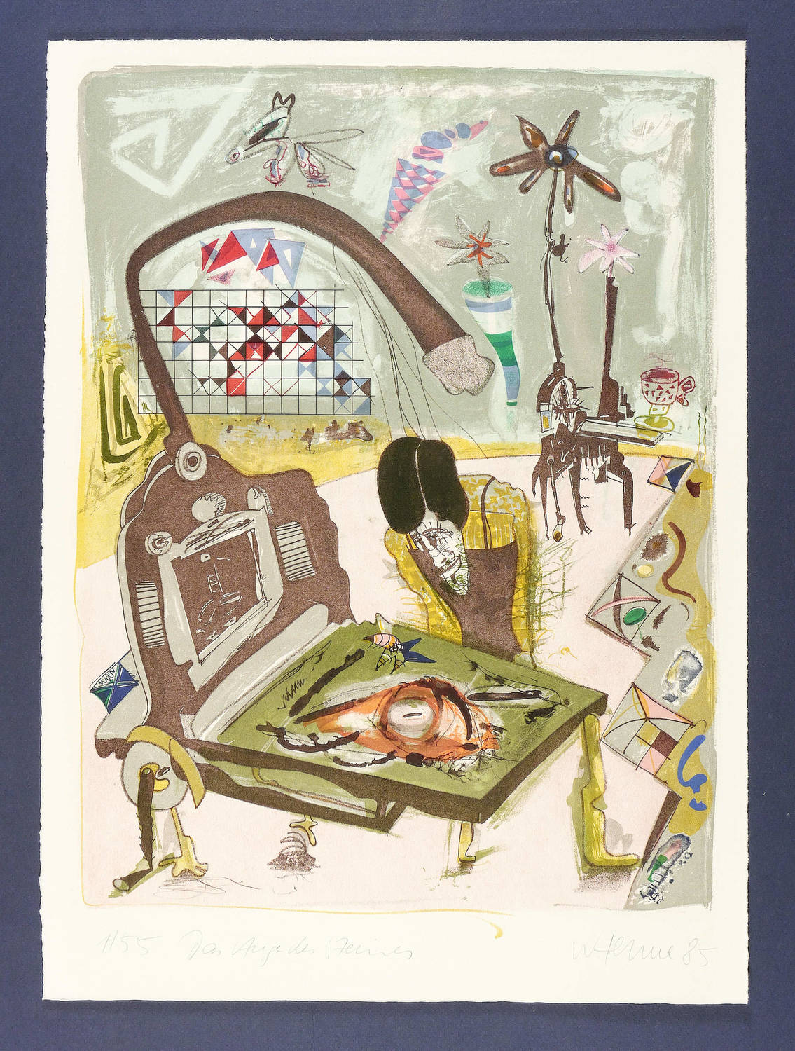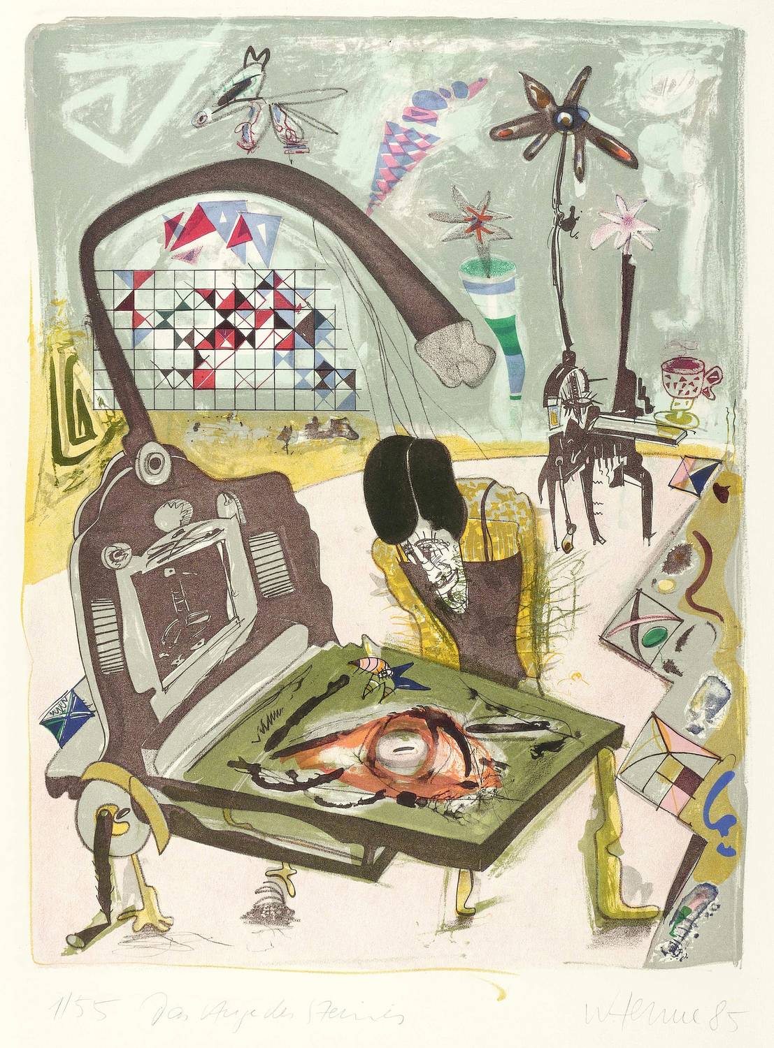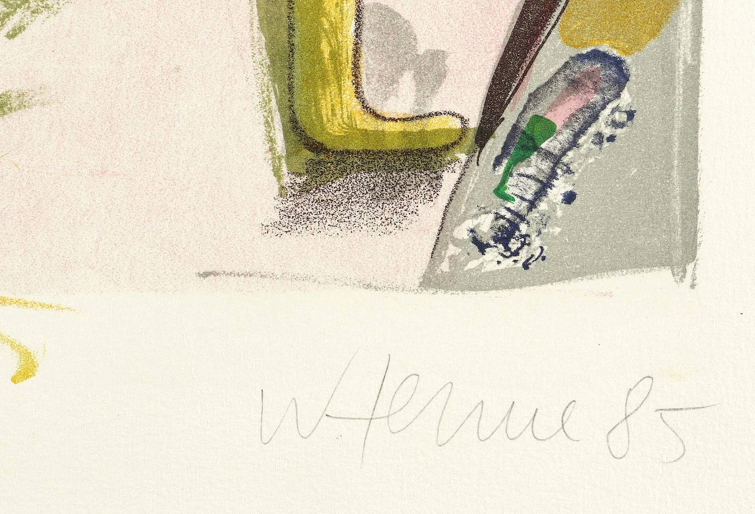 1985. Farblithografie / Feder- & Pinsellithografie, in 8 Farben, auf weißlichem Hahnemühle-Bütten. – Von Wolfgang Henne. – Auflage Exemplar Nr. 1/55. – 48,6 x 36,1 cm (Darstellung), 54 x 40 cm (Blatt).
