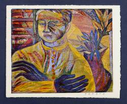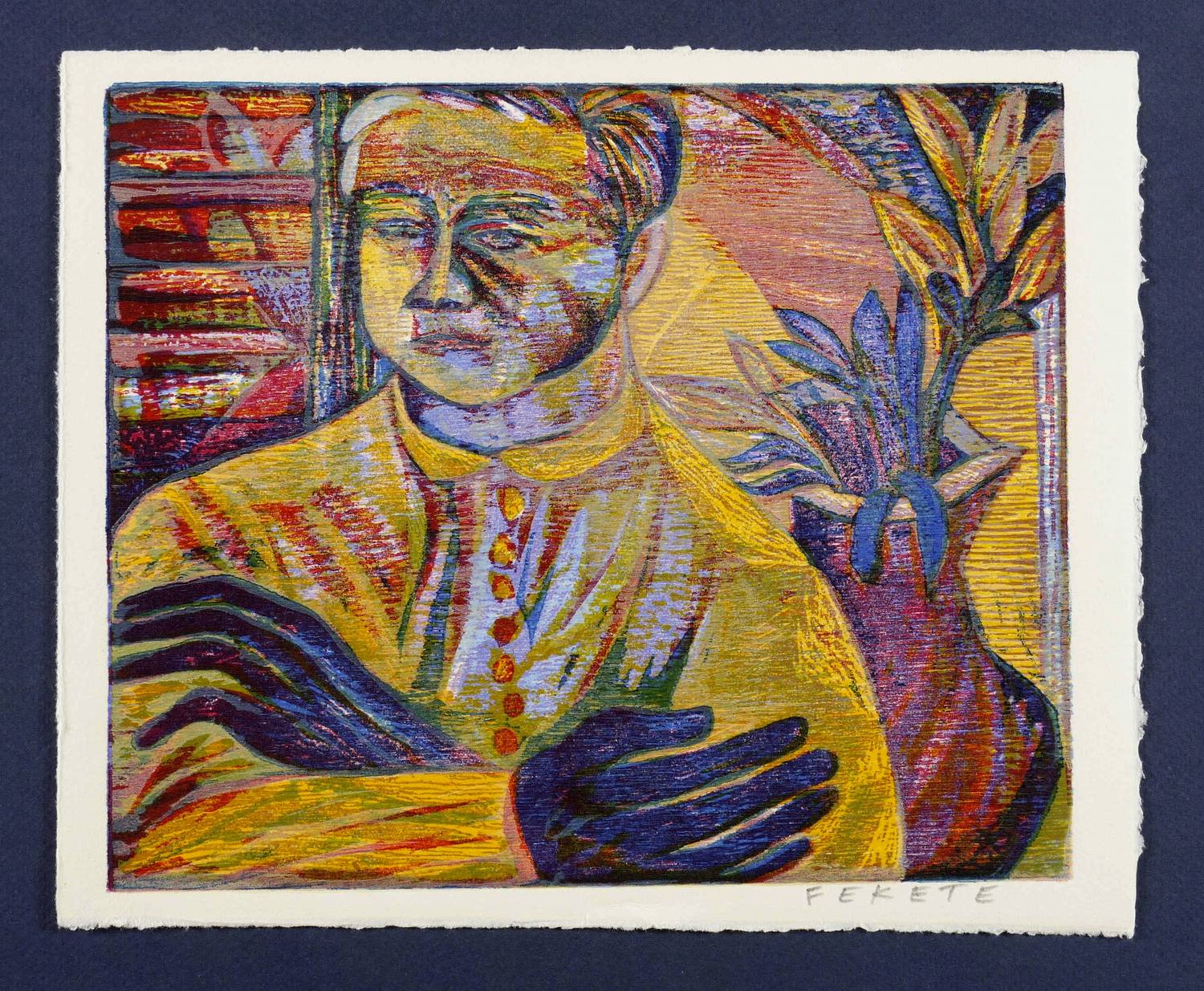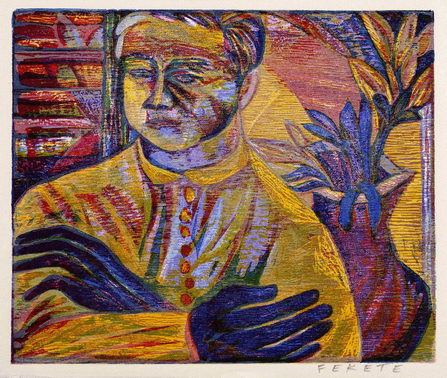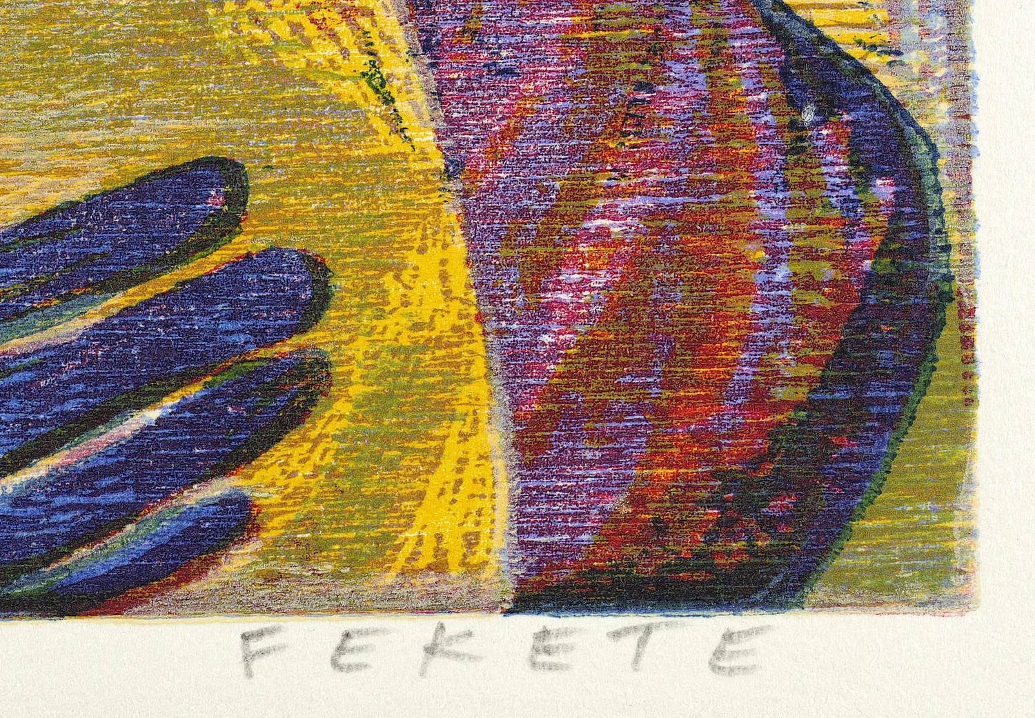 Esteban Fekete (1924 Cinkota / Budapest - 2009 Dieburg). Deutsch-argentinischer Maler, Zeichner und Grafiker. Arbeitete in verschiedenen Techniken wie Öl und Tempera, aber auch in Mischtechniken auf Papier, Holz oder Hartfaser. Anfang der 1970er Jahre entstanden Email-Bilder, Zeichnungen und Linolschnitt. Seine ureigene Technik ist allerdings der Holzschnitt, insbesondere der Farbholzschnitt, mit dem er sich einen Namen machte. So entwickelte er eine eigene Schnitt- und Bearbeitungstechnik für die Holzplatten. Für die Farbgebung verwendete er eigens dafür gesuchte Ölfarben.